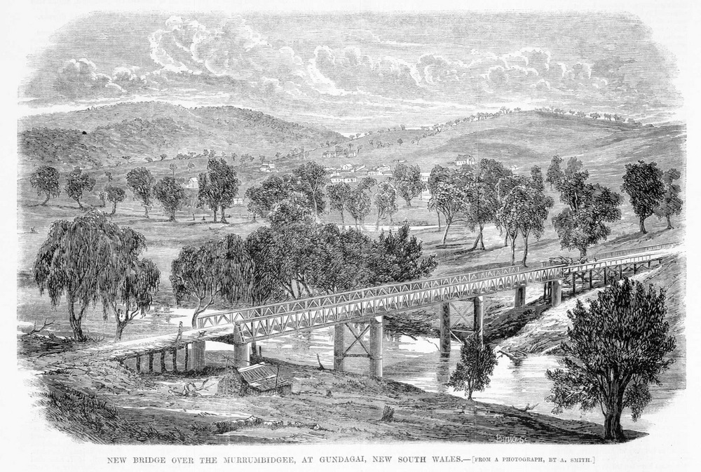 Newly built Prince Alfred Bridge at Gundagai in 1867. Etching of the new bridge from a photograph by Mr. A. Smith, jun., of Adelong. Published in The Illustrated Australian News for Home Readers November 26th 1867