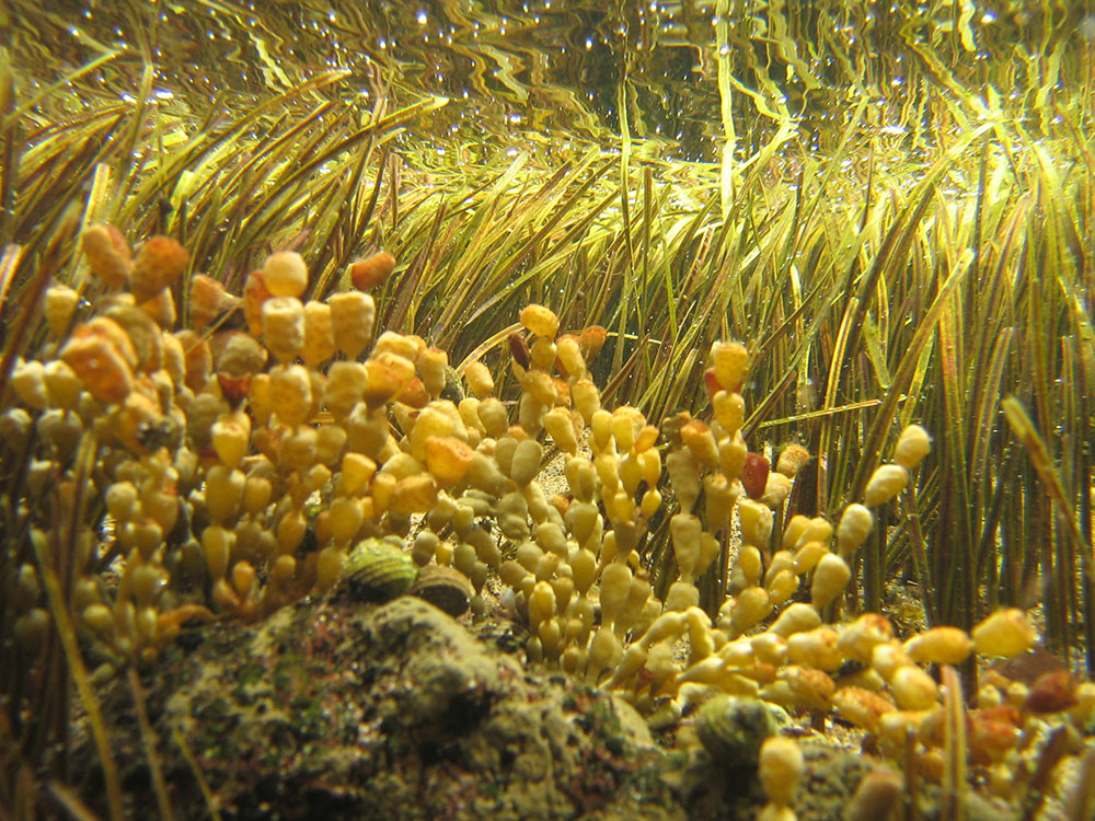 Zostera and Hormorsira- Neptune’s necklace and seagrass provide habitat for many different animals (credit Isobel Bennett) - Eelgrass (Zostera) is a type of seagrass, which are the only flowering plants that can live underwater. They grow in sheltered shallow waters in sand or mud anchored in the sediment by a root-like structure called a rhizome. Seagrasses are important habitat for many species of plants and animals.