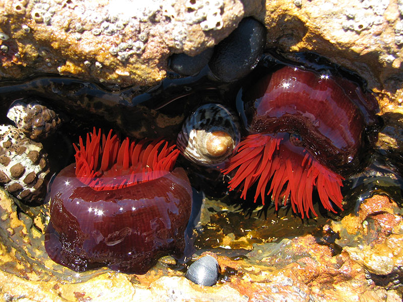 Waratah anemones are easy to spot at low tide as they look like maroon-coloured blobs, but when the tide comes in they open up to look like a rich, red flower. The ‘flower’ is in fact tentacles, which are armed with minute stinging cells. These tentacles reach into the water to catch food. Image courtesy Isobel Bennett