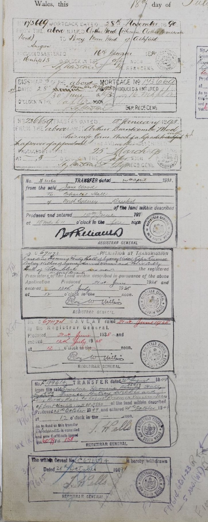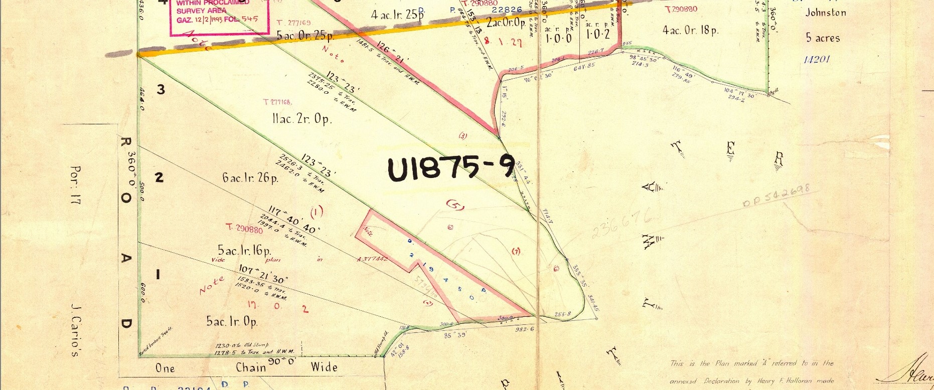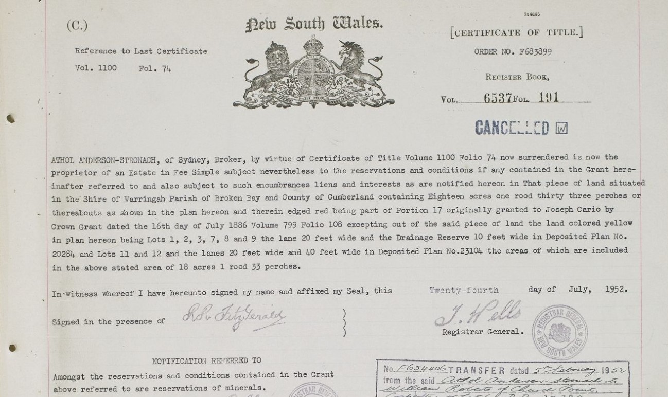 Frederick Chave sells to 18 acres 1 rood 33 perches to Francis Bolton on June 19 1893 – Vol-Fol 1100-74. Mr. Bolton sells to Newton Charles Singleton of Lovett Bay on June 1st 1942, who sells off some lots, and then sells to Athol Anderson Stronach (Portion 17), Broker, May 8th 1950, who sells off some lots and then the residue becomes Vol-Fol: 6537-191, Certificate registered July 24th 1952, as 18 acres 1 rood and 33 perches still, and he sells lots into 1950’s.
