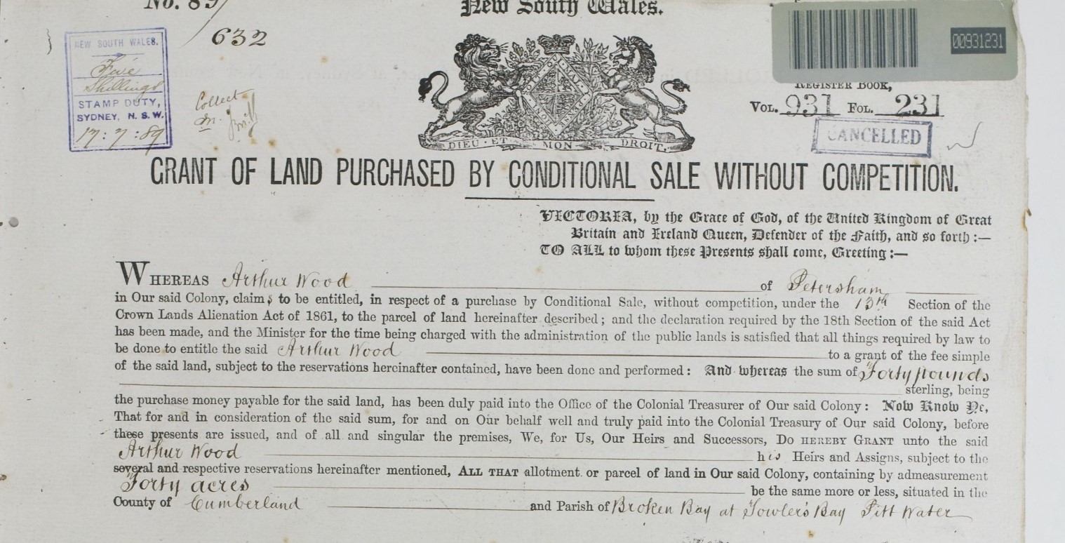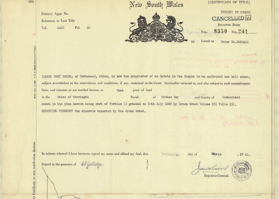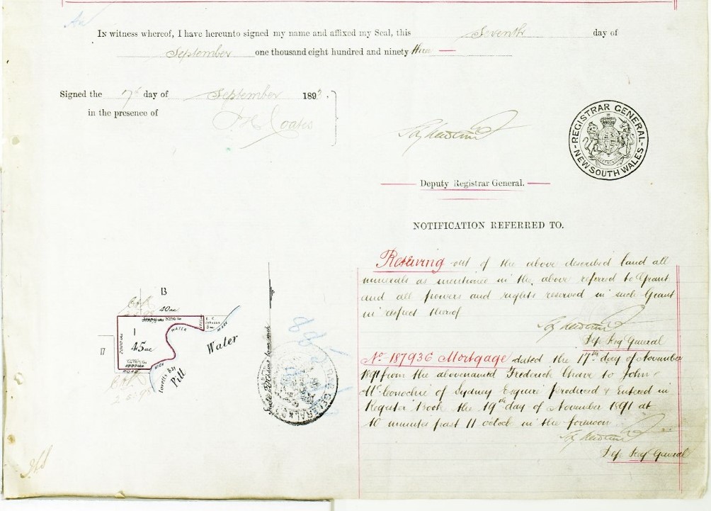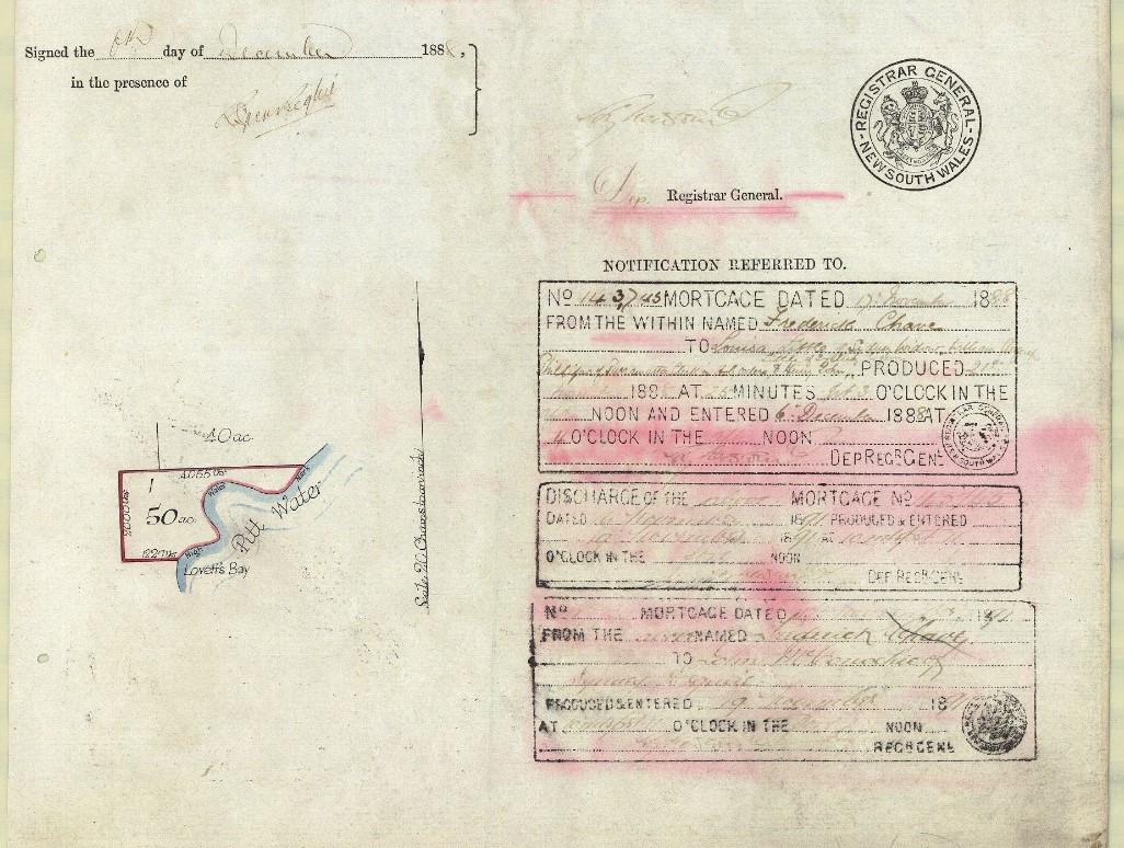 The remainder 20 acres, towards the west and head of Lovett Bay, is registered in Vol-Fol 808-161 as sold to Robert John Bell and Alexander Bell, both of Balmain, Engineers, on October 14 1886: