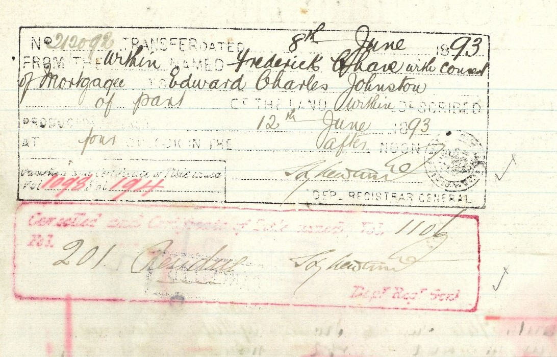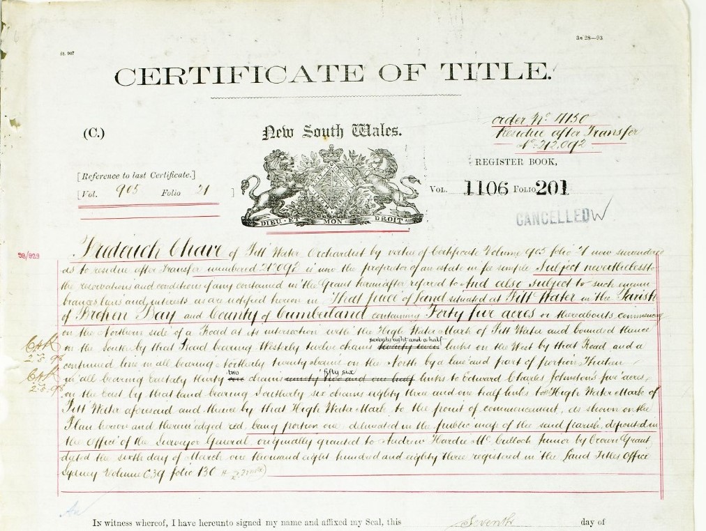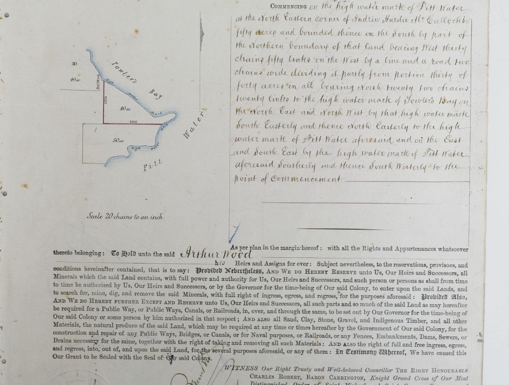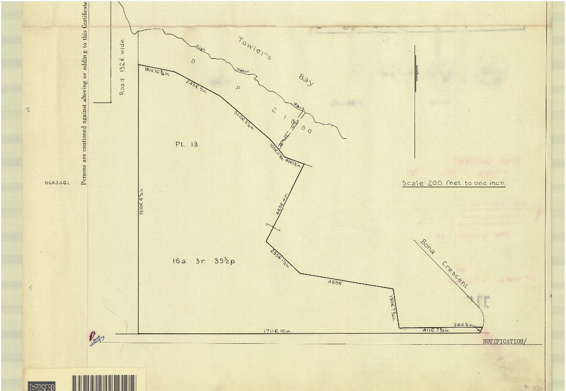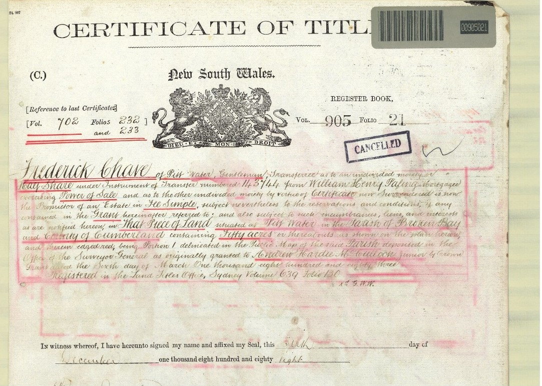 Certificate of Title Vol-Fol 1100-98 shows 1 acre 2 roods and 7 perches owned by Frederick Chave of Pitt Water, July 4 1893, with a road (or track) 1 chain wide alongside the 18 acres bought by Bolton from Mr. Chave. One chain is 66 feet wide or 20.1 metres - this is between the original Cario land grant and that land grant of 50 acres owned by Andrew McCulloch.