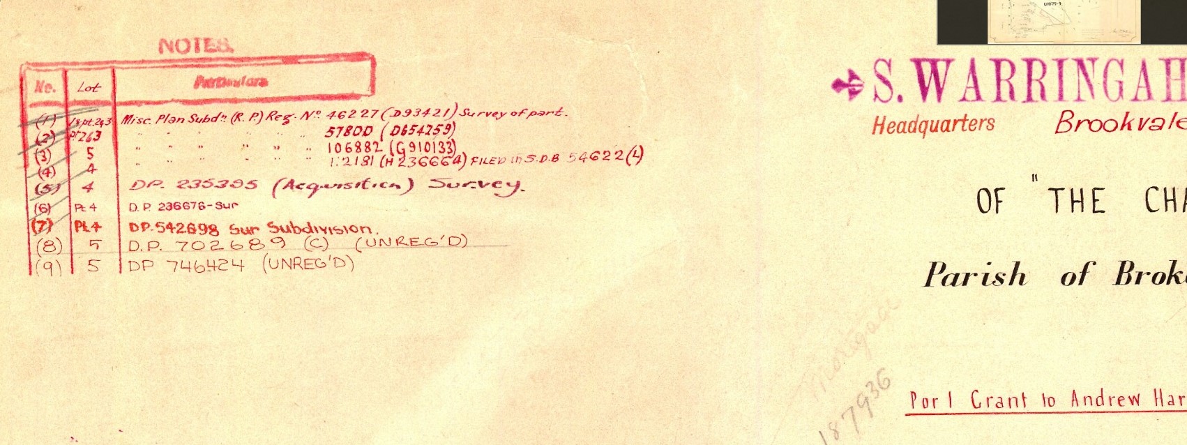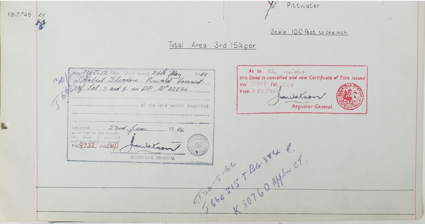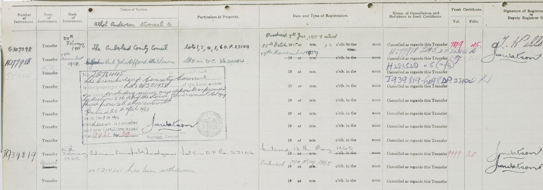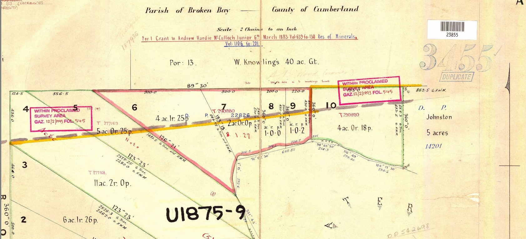 Mr. Stronarch has 10 acres of Portion 17 resumed by the County of Cumberland Planning Scheme on February 24th 1955 (Vol-Fol: 7079-45 Lots 1, 2, 4, 5, 6 – lot 3 already sold – Cert. of title registered Feb. 13 1956) and more on March 4 1960 and more on April 26 1963 (Vol-Fol 9421-39) He passed away February 12th 1985.
