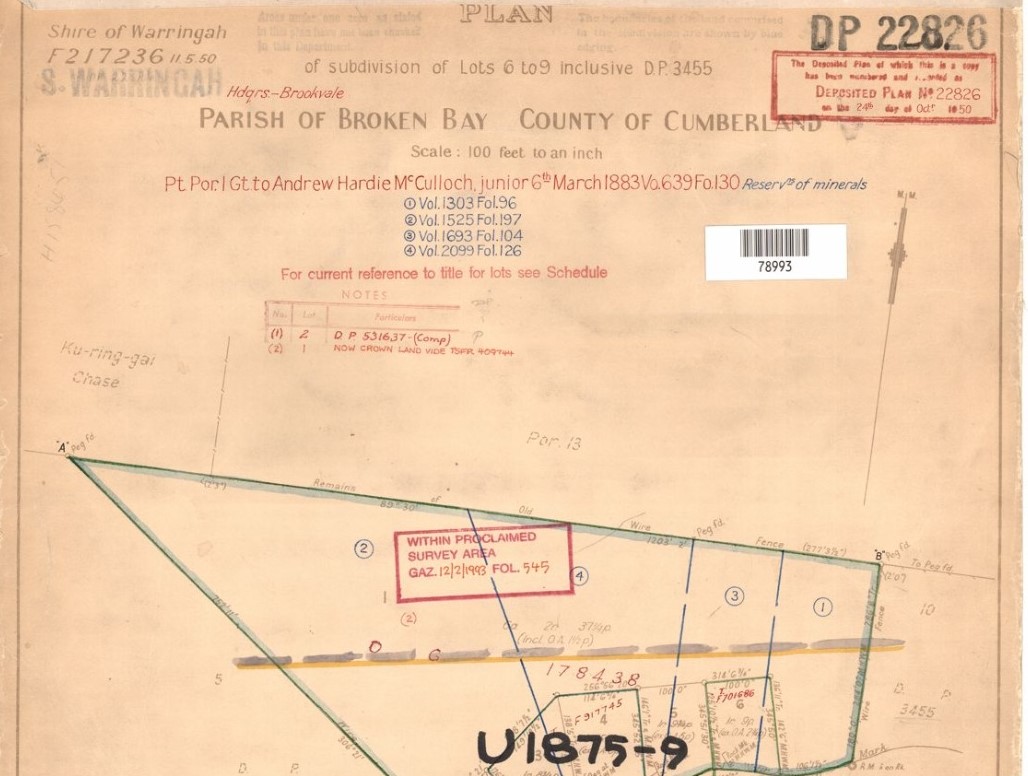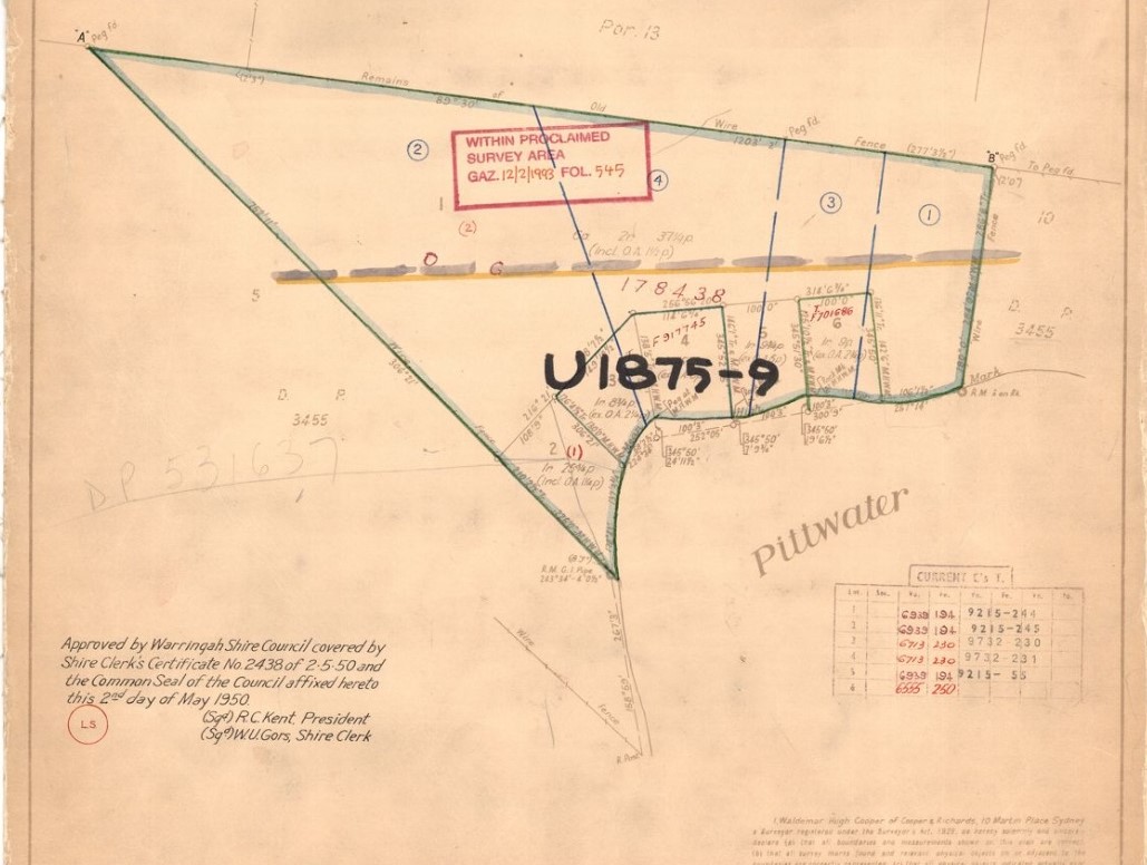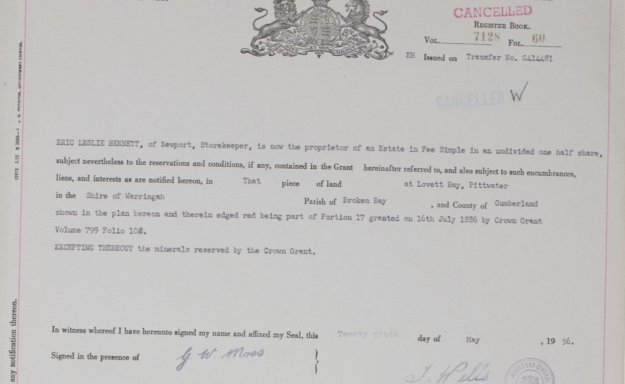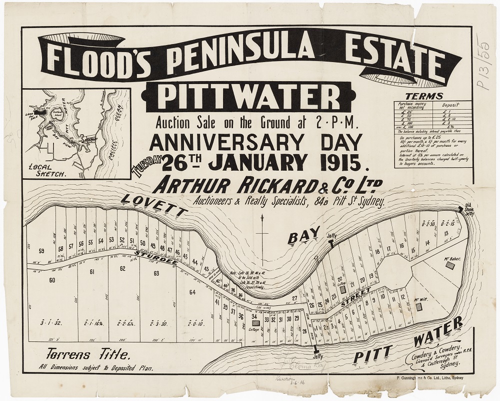 PITTWATER. — Block of Land, 11 acres 3 roods 2 pers. WATER FRONTAGE TO LOVETT'S BAY. Hardie and Gorman. Advertising (1914, January 14). The Daily Telegraph (Sydney, NSW : 1883 - 1930), p. 4. Retrieved from http://nla.gov.au/nla.news-article239020170