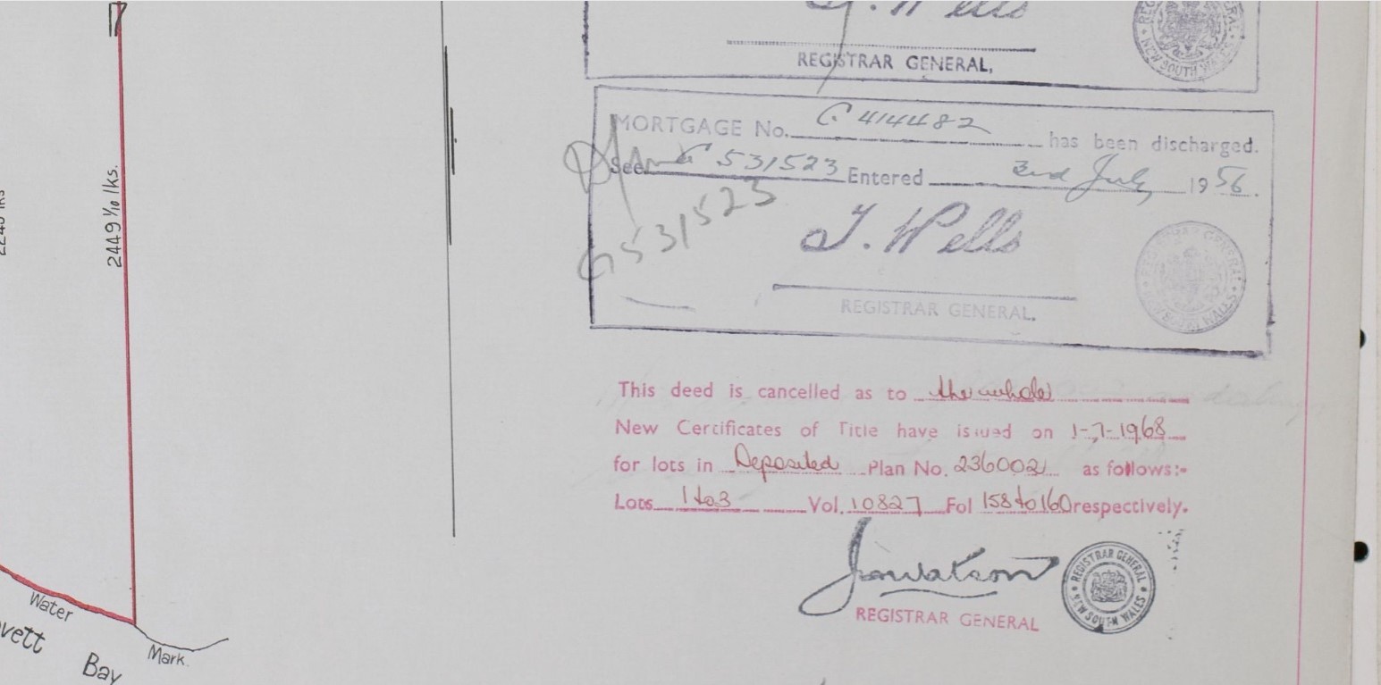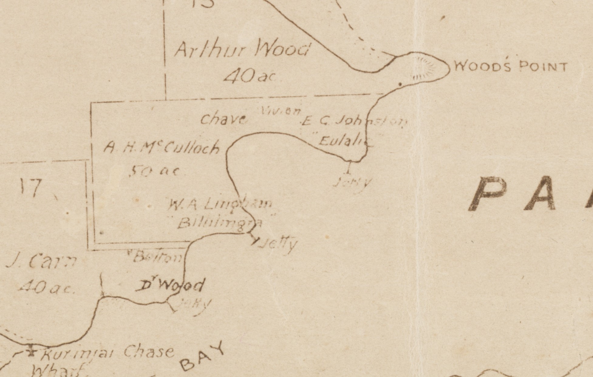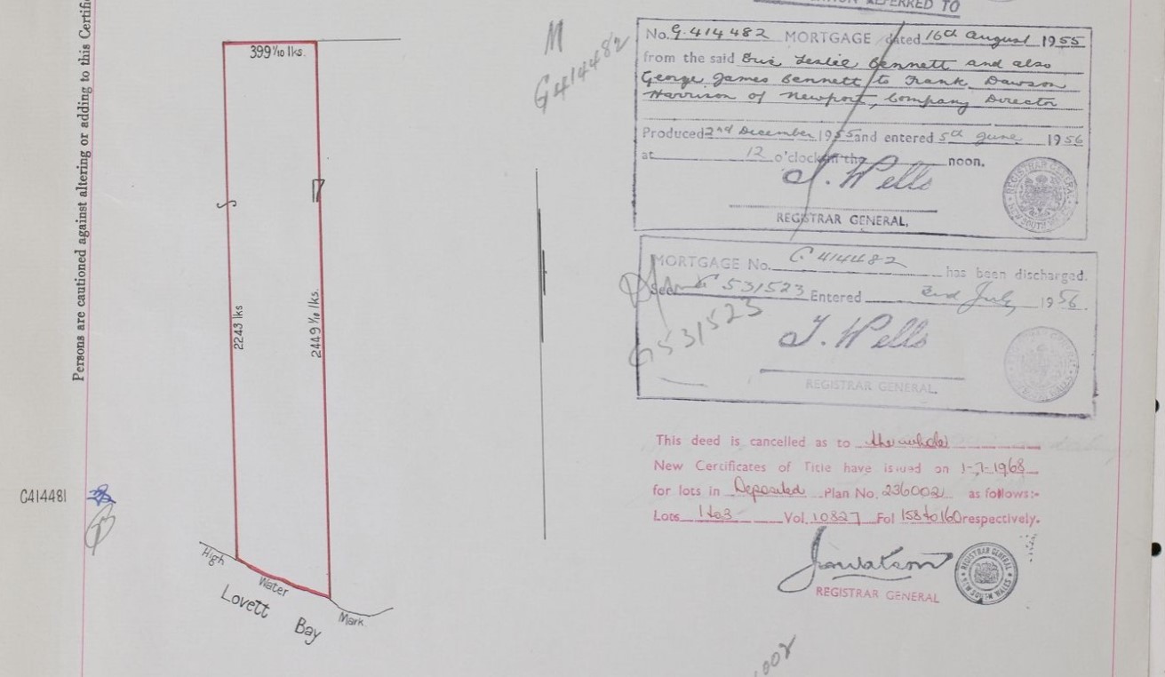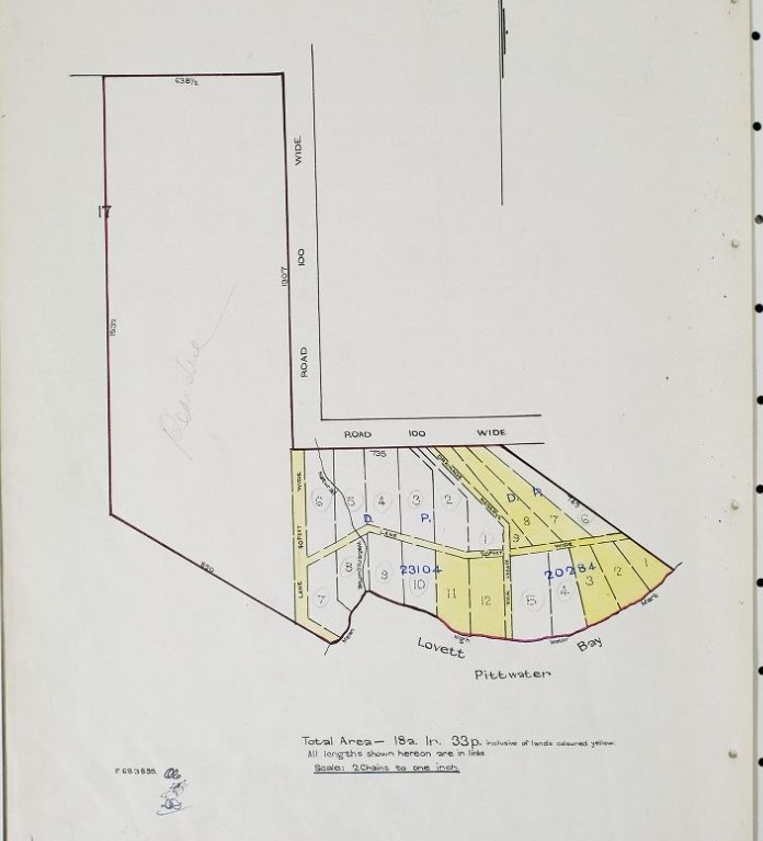 This was then part of the waterways, and with those who bought land needing to access it via the waterways, a series of Permissive Occupancies for Special Leases were sought and granted on the 'Sturdee-Rocky Point ide of Lovett By as well as from the Trustees wharf at the base of Dorothea's acreage and up to the eastern end of Little Lovett Bay.