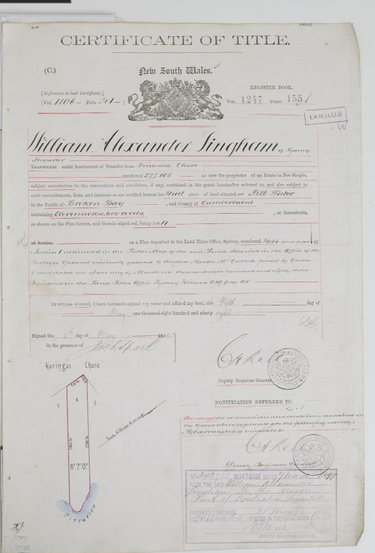 Cario sells to Frederick Chave August 23 1856 part of (20 acres): Vol- Fol 808-173 – this is where the causeway and Kuring-Gai Chase Trust stone jetty/wharf is sited.