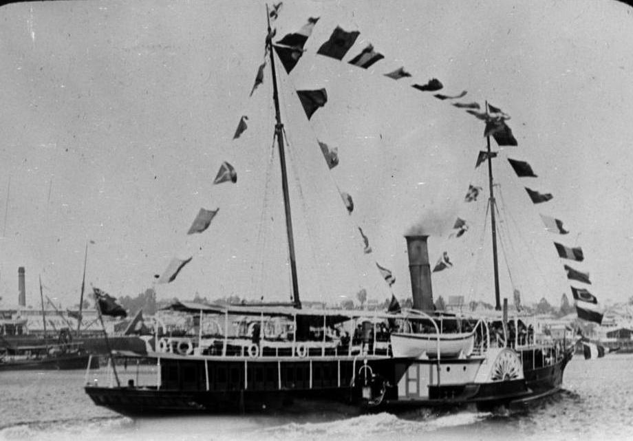 Festooned Lucinda cruising on the Brisbane River. Image No.: StateLibQld 1 270485, courtesy State Library of Queensland