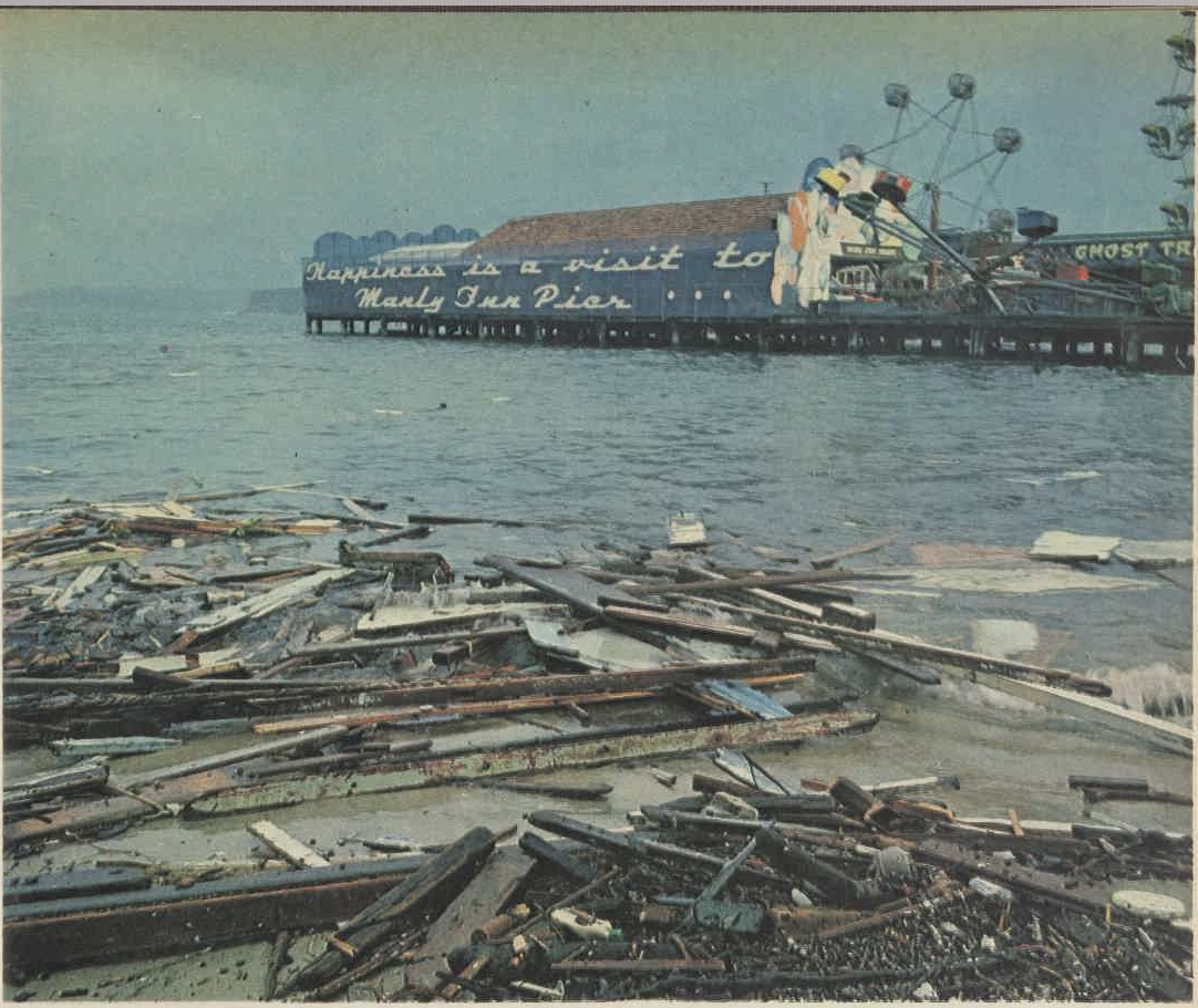 ABOVE: Splinters of pleasure craft and other pieces of wood drift dejectedly beside the Manly pier. At the devastated Harbour pool on the other side of the pier, members of the Maritime Services Board had worked from 6 a.m. to clean up the debris. AFTERMATH OF A DISASTROUS WEEKEND (1974, June 12). The Australian Women's Weekly (1933 - 1982), p. 8. Retrieved from http://nla.gov.au/nla.news-article44557918