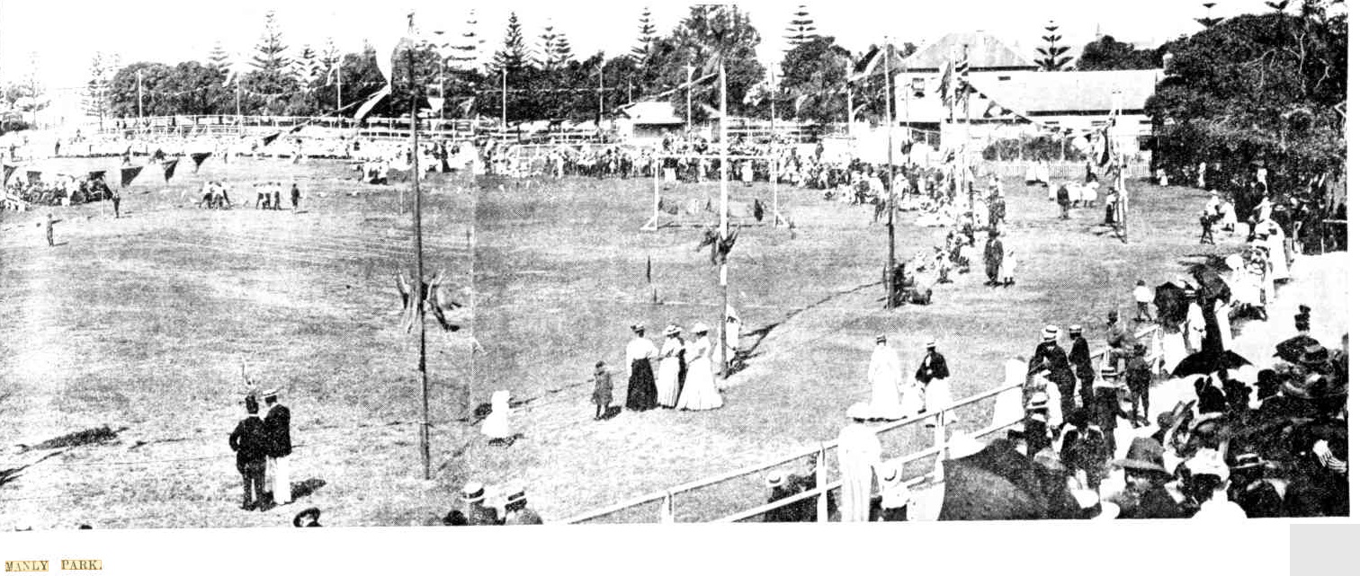 A large committee of Manly residents, headed by the Mayor (Alderman W. H. Fletcher), has for some time been perfecting arrangements for entertaining the children of Manly and district by commemorating the inauguration of the Commonwealth. The festival was held on Wednesday, January 16, in Manly Park, and proved a success. The park had been specially decorated with flagpoles loaned by the Government Architect. These with their banners, trophies, and lines of bunting gave the oval a gay appearance. The children assembled on the flat in great numbers and many were seated on the surrounding slopes.
