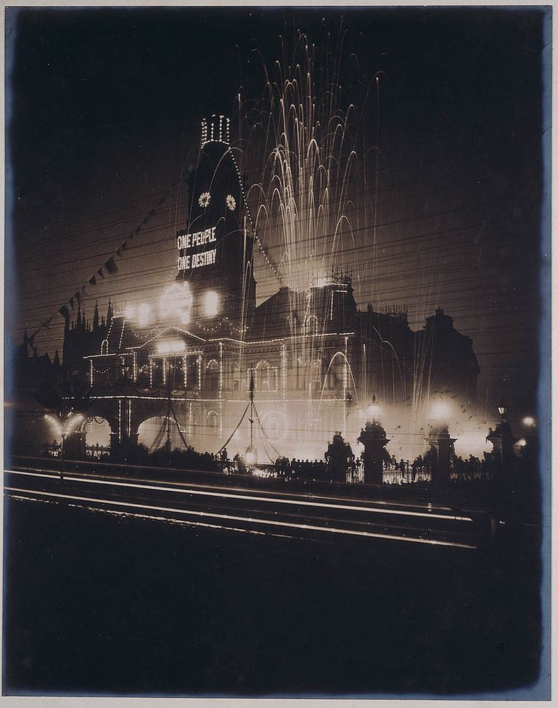 The Sydney Town Hall illuminated in celebratory lights and fireworks marking the Inauguration of the Commonwealth of Australia, 1901. The sign reads One people, one destiny. photo by W. A. Gullick - courtesy State Library of New South Wales
