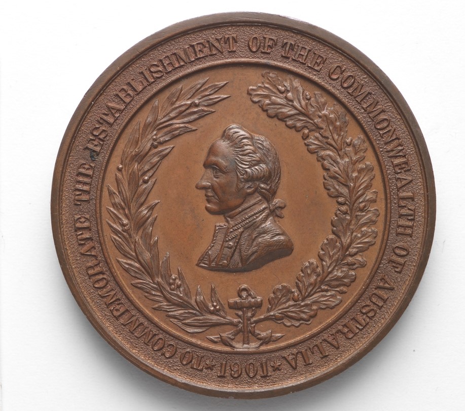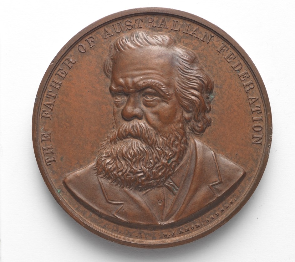 Medallion commemorating the establishment of the Commonwealth of Australia, 1901, featuring Henry Parkes, the Father of Federation 1879-1901 - Obverse of medallion features Sir Henry Parkes and legend 'The Father of Australian Federation' and name of issuing firm 'W.J. Amor Sydney' Reverse of bronze medallion features Captain James Cook and the legend 'To commemorate the establishment of the Commonwealth of Australia 1901'. Items; a9539001h and a9539002h courtesy Mitchell Library, State Library of New South Wales.