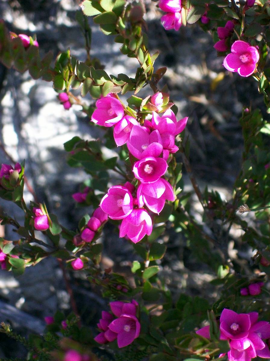 Boronia serrulata, or Native Rose in the pink variety, occurs naturally within a radius of about 50 km of Sydney from Gosford to the Royal National Park, where it is found growing in semi-shade amongst outcrops of Hawkesbury sandstone.
