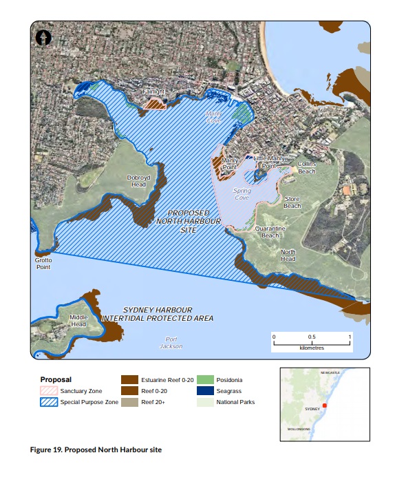• Three new zones would be created: a 325 hectare special purpose zone, and two sanctuary zones with a combined area of 51 hectares, one at Fairlight and the other at Spring Cove (between Quarantine Beach, North Head, to Manly Point and east to Collins Beach).