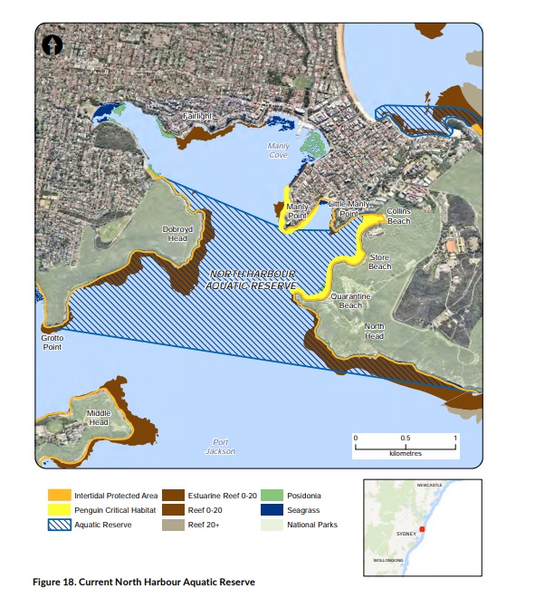 The 257 hectare North Harbour Aquatic Reserve (Figure 18) was established in 1982 and spans the area between North Head and Dobroyd Head. All marine species other than finfish are protected in the reserve, which allows line fishing for finfish only. All other fishing and collection methods are prohibited.