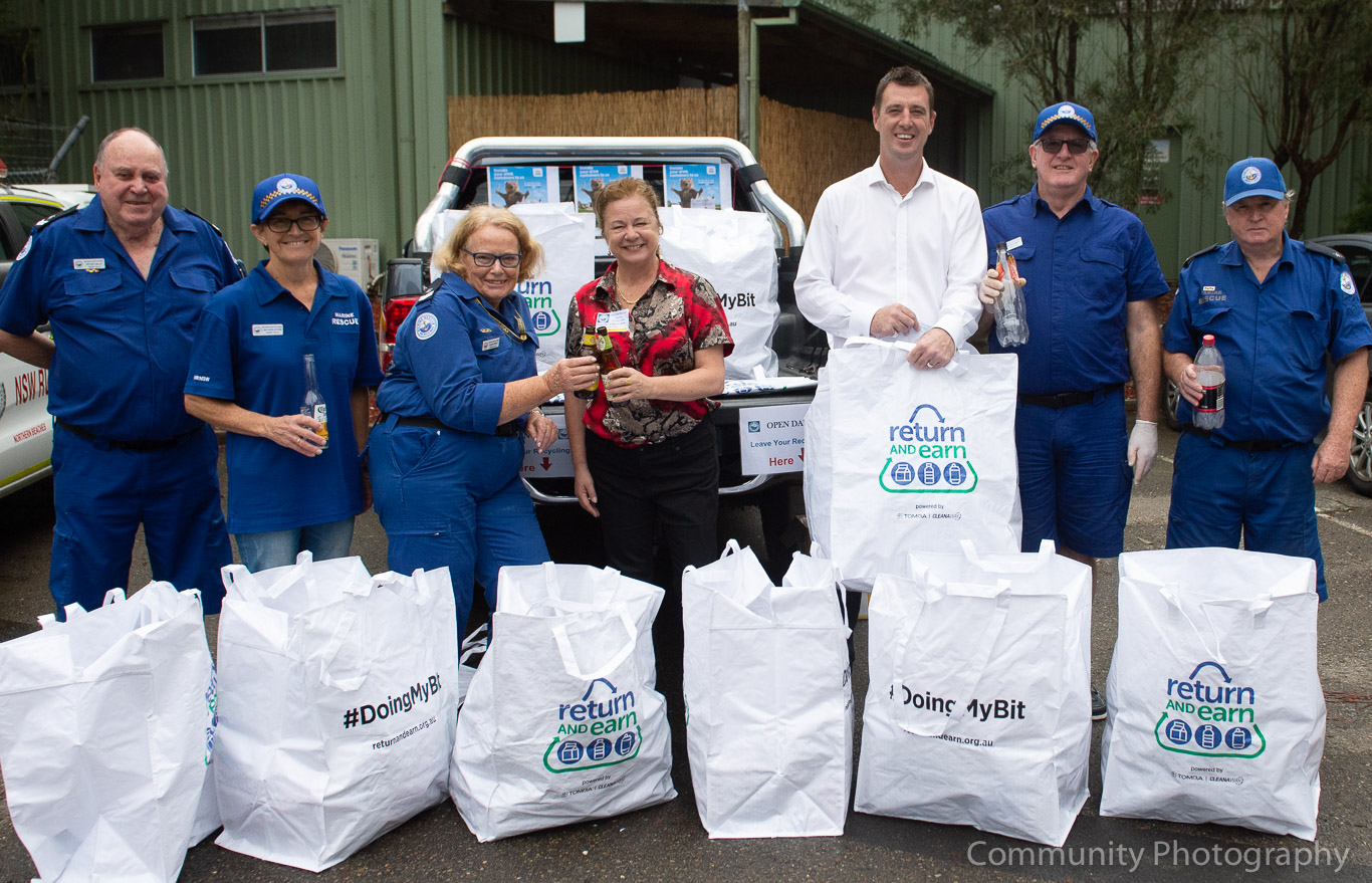 Mayor Michael Regan and Deputy Mayor Sue Heins with Marine Rescue Sydney volunteers supporting Return and Earn drinking container recycling.