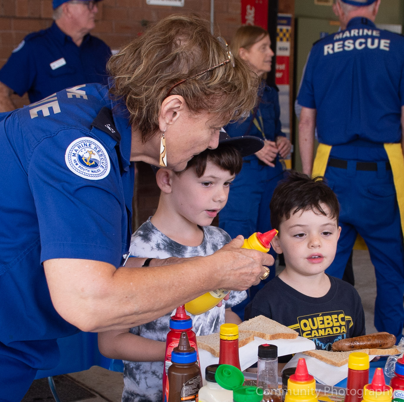 Marine Rescue Sydney volunteer Pamela Sayers serving lunch to a couple of young guests.