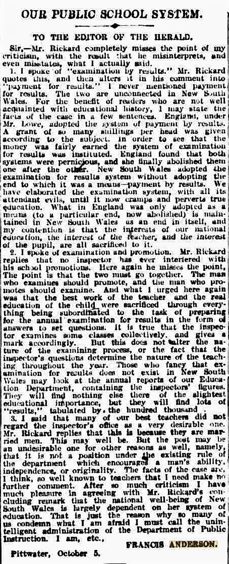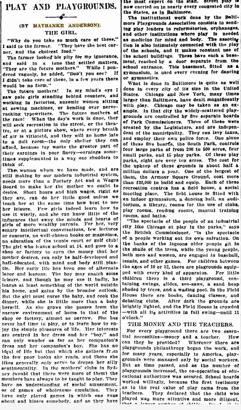 Maybanke was educated to be a teacher from an early age, as had her mother and grandmother been prior to her, and in keeping with the matriarchal line of belief for those two women that a woman should be able to support herself. [2.]