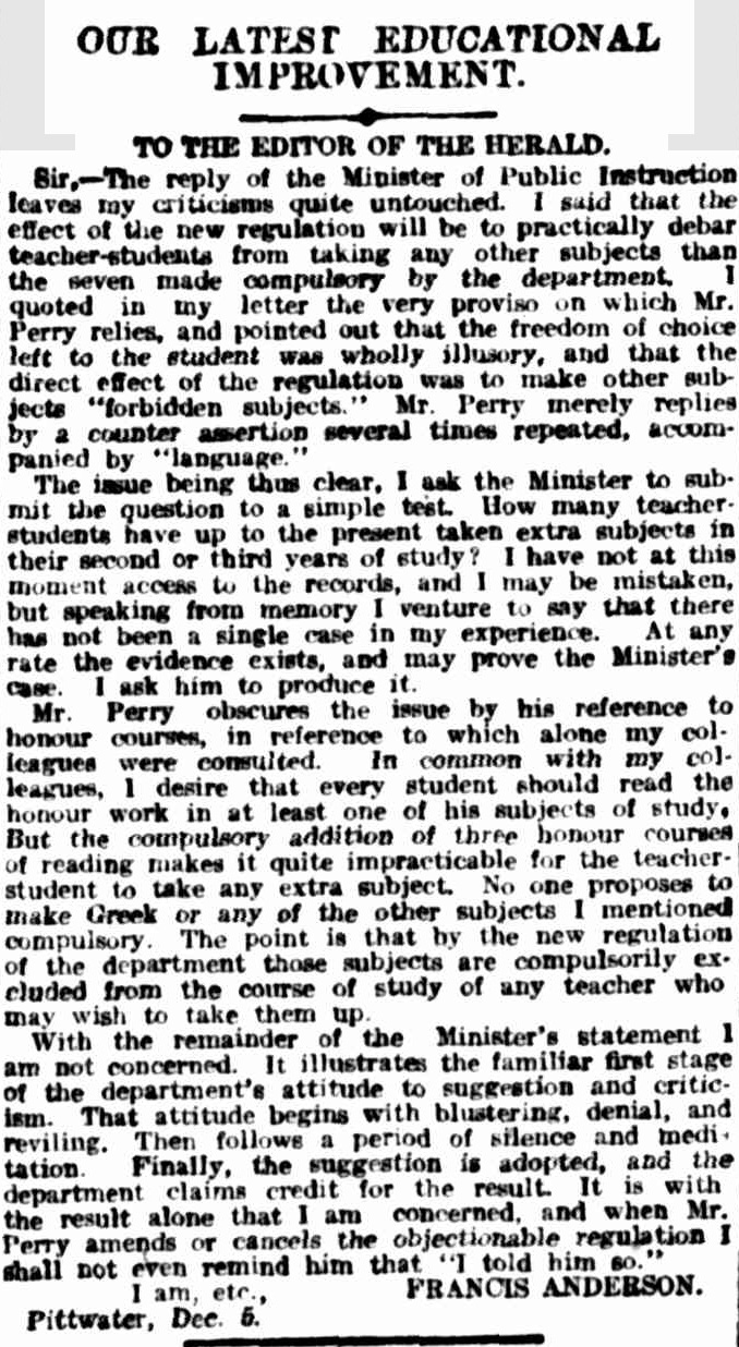 Many of us have abiding memories of her ripe scholarship and brilliant wit. Among other achievements rarely emulated she taught her girls Greek and oarsmanship. Her friend, Mrs. Garvin, was the pioneer head of the Sydney Girls' High School.