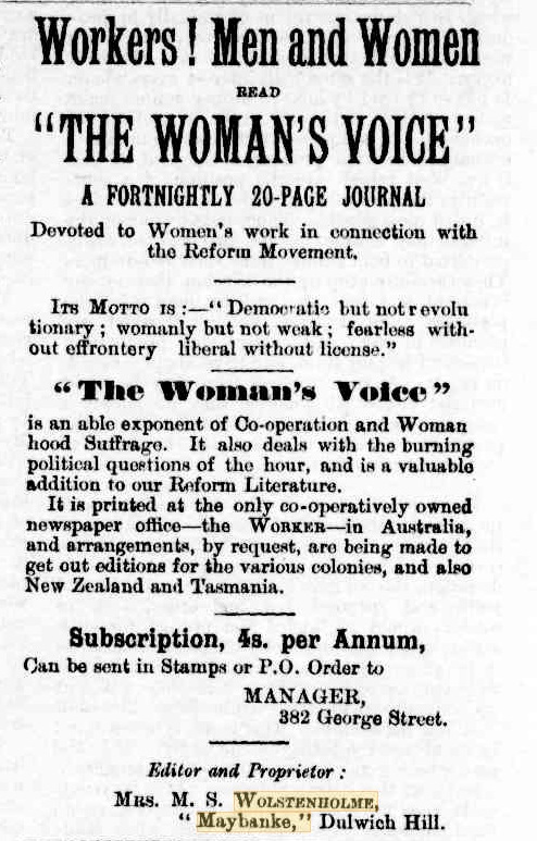 Born February 16th, 1845 at Kingston-on-Thames, Surrey, England, and arriving in Sydney in January 1855, Maybanke Susannah Selfe was the daughter of Henry Selfe, plumber and inventor, and his wife Elizabeth, née Smith. With her two brothers, Norman and Henry, the Selfe family settled in the waterfront Rocks living in Mary Reibey's house (Mary was Molly Haydock - wife of Thomas Reibey of Hawkesbury River cargo renown).