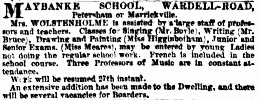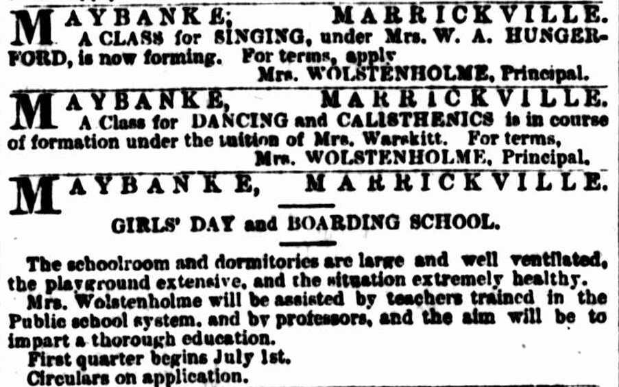 Sept. 3rd, at St. Philip's Church, Sydney, by the Very Rev. the Dean, Edmund Kay, eldest son of James Wolstenholme, of West Maitland, to Maybank Susannah, only daughter of the late Henry Selfe, of Warragamba, and Lower Fort-street, Sydney. Family Notices (1867, September 7). The Maitland Mercury and Hunter River General Advertiser (NSW : 1843 - 1893), p. 1. Retrieved from http://nla.gov.au/nla.news-article18726451