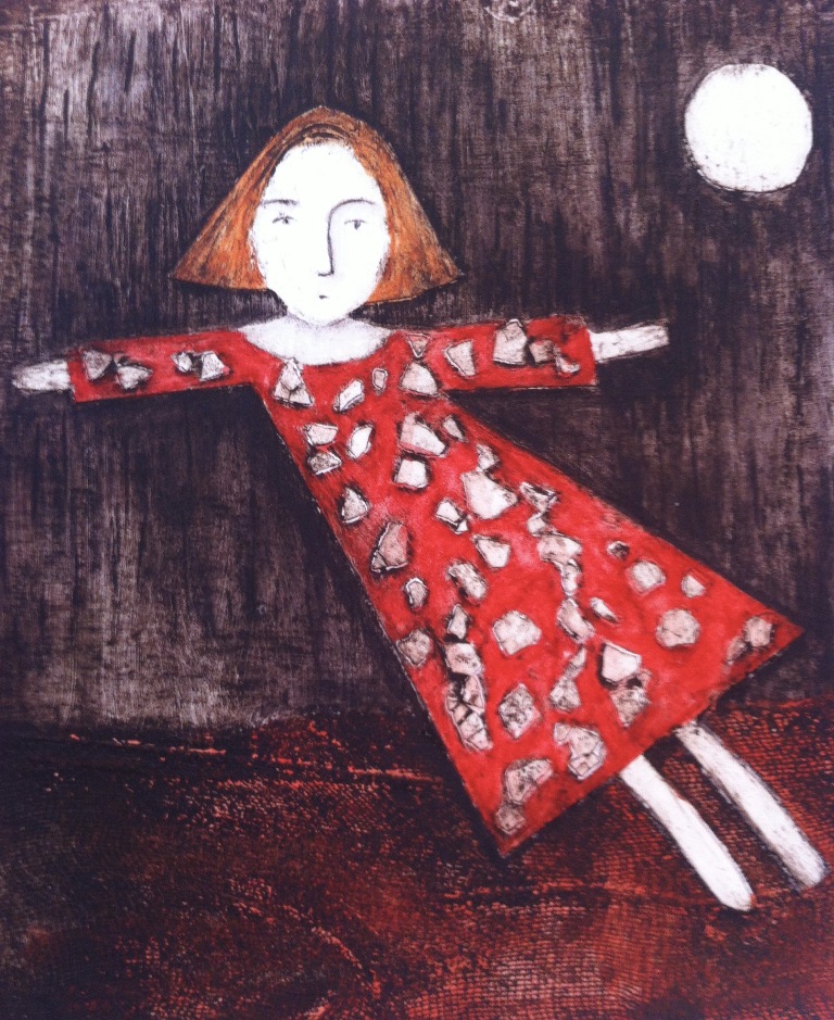 Flying daughter 1 - handcoloured collograph