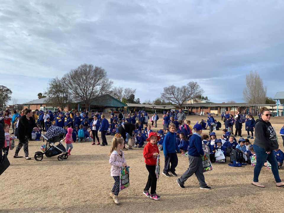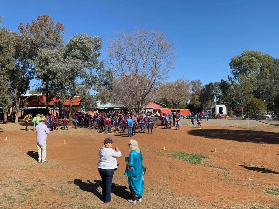 The Bashers were given a rousing welcome for lunch by the students at Nemingha Public School, 9km from Tamworth. The rural school caters for 220 students from the area, and received a donation of musical instruments and an earth ball worth $3,000.