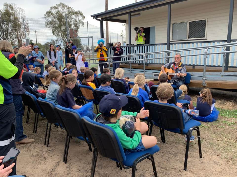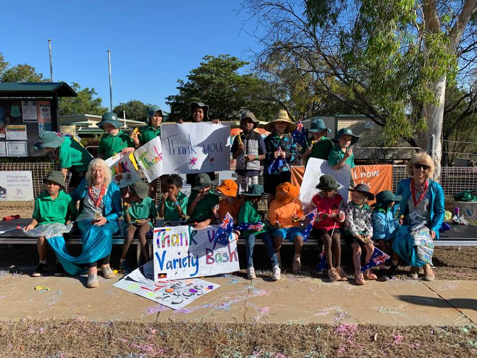 Variety donated $6,800 worth of sensory musical equipment for the playground that will help the kids develop problem solving skills, express emotion and build confidence. The students of the school entertained the Bashers with a song, before John Williamson returned the favour with a rendition of his iconic hit, True Blue.