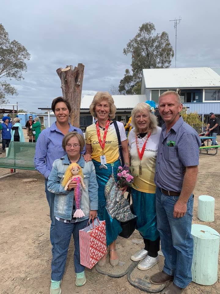 Below: Mermaids of Palm Beach Beryl Driver OAM and Viktorija McDonnell at Yelarbon State School. Here they are meeting Elri Kriel, a Baha 5 recipient and her family.