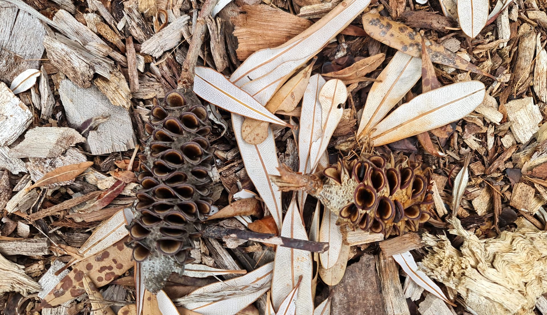 Coastal Banksia, Banksia integrifolia, seed pods and leaf litter