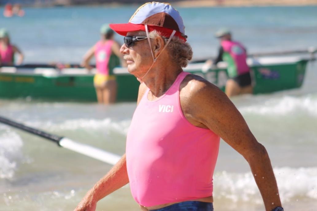 Photos: Bernard "Midget" Farrelly at Warriewood Surf Boat Carnival, 2014 and SLS SNB Branch comp at Palmy in 2016 (top). Midget Farrelly at Palm Beach, 1964 – photo by by John Witzig, reproduced with permission of the National Portrait Gallery, Canberra.  - coloured pics: A J Guesdon