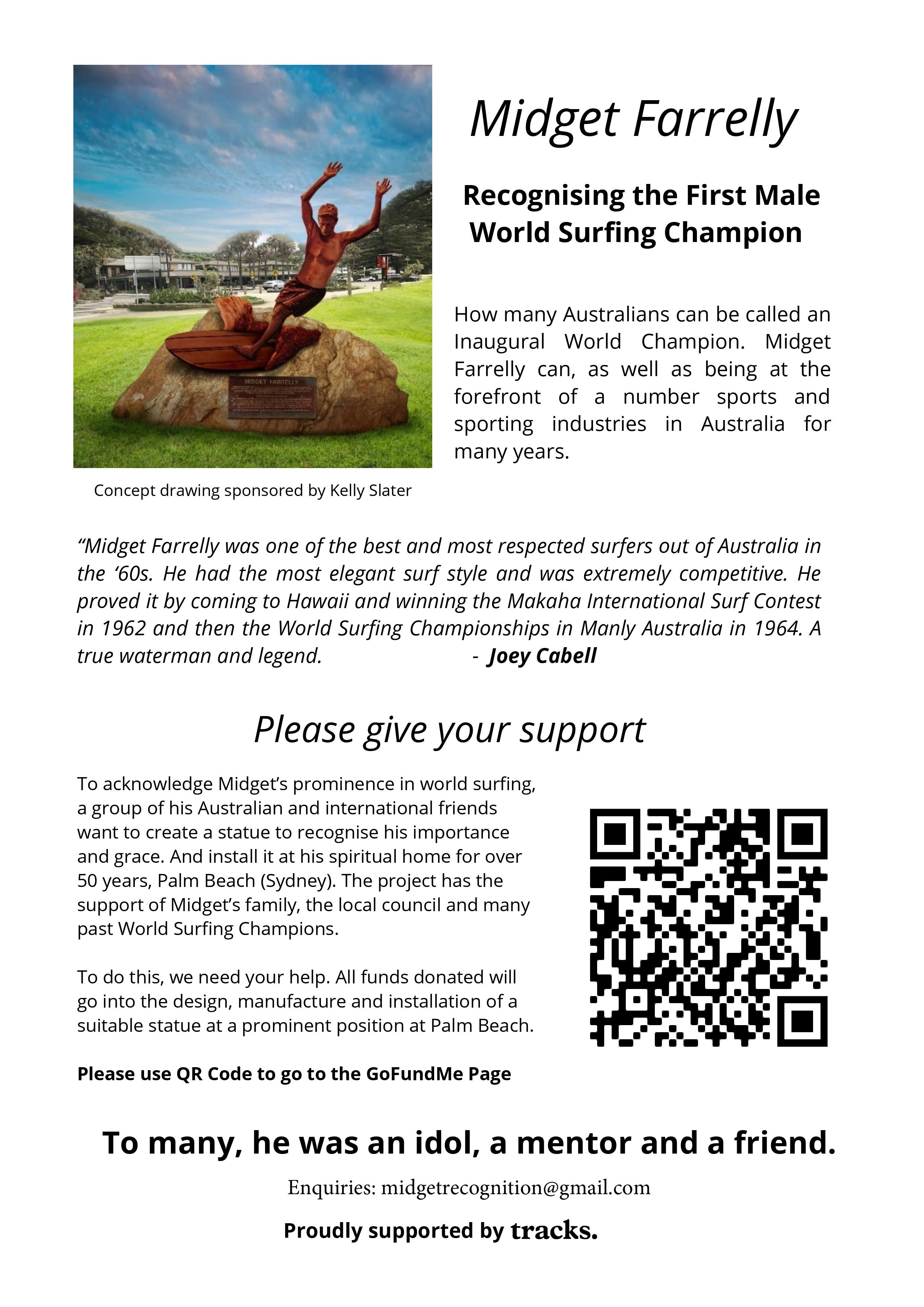 Supported by World Champions such as Kelly Slater, Barton Lynch, Layne Beachley and Tom Carroll, the Committee led by Bruce Raymond, Gordon Lang, Christine Hopton OAM and Nick Carroll aims to raise funds in order to install a memorial statue of Midget at Palm Beach, his home break of six decades. A fundraising campaign has been launched, with donations over $1000 able to be made via the Manly Art Gallery, which provides a full tax deduction.