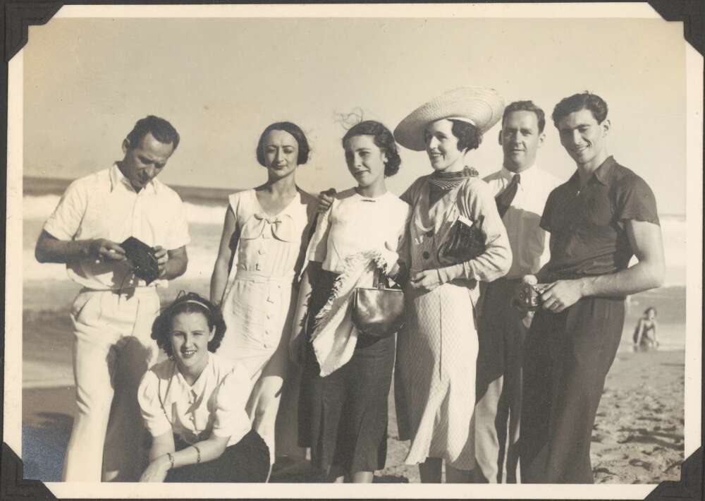 Top: Dancers from the Monte Carlo Russian Ballet with two Australian friends at Bungan Beach (actually Palm Beach), NSW, left to right, Jean (Jan) Hoyer, Anna Skarpa (Skarova) (girl crouching), Nathalie Branitzka, unidentified dancer, the two friends (with hat; Ailsa Allan - nee Craig), and Igor Youskevitch, 1936 or 1937] - Part of Dr Ewan Murray-Will's album of photographs of performers from the Ballets Russes, on tour in Australia, 1936-1937 nla.obj-149943187-1 Courtesy National Library of Australia.