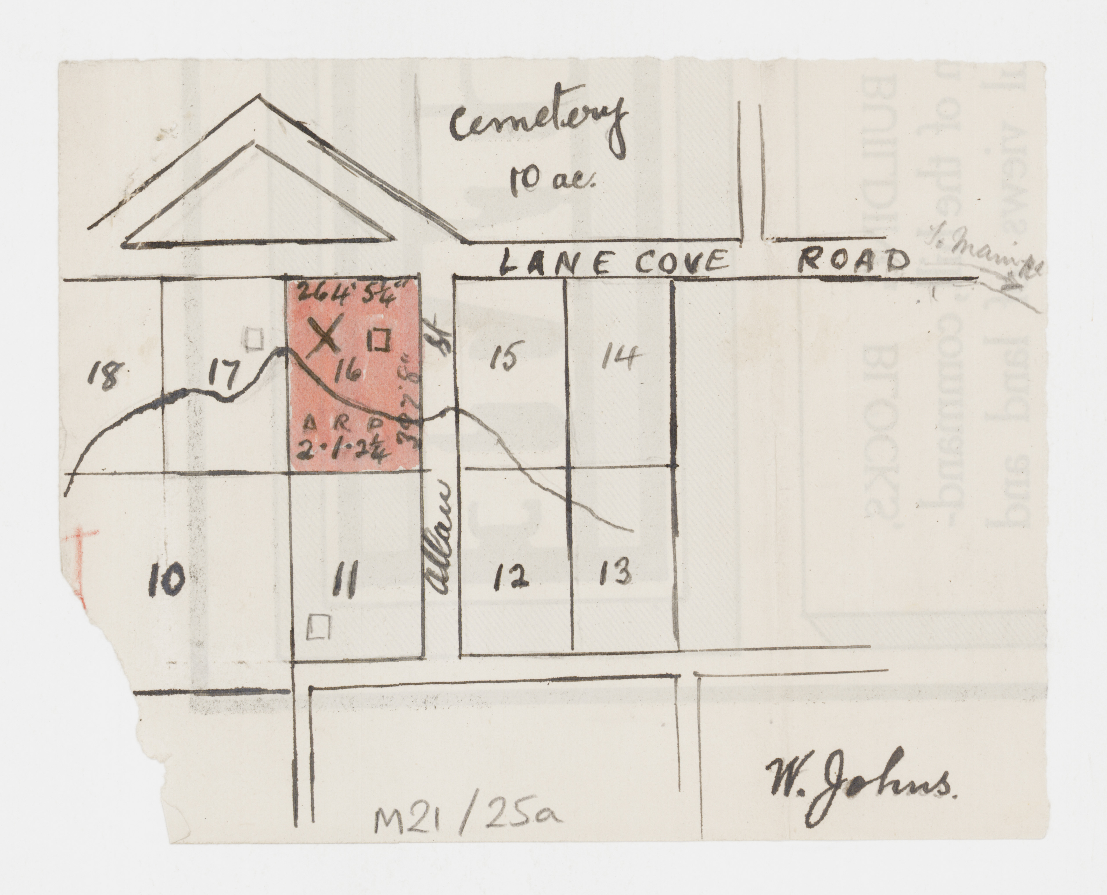 The land was part of an 80 acre grant to notorious local farmer Thomas Collins, although by then he had onsold it and it eventually became part of a Halloran subdivision. Some of the Collins land had already been subdivided, including the 'Collingwood Estate' which began selling in 1886. This subdivision included the block upon which the “Rock Lily” Hotel was built. The subsequent subdivision of the “Rocklily Estate” in 1905 clearly shows the cemetery in the new location on Lane Cove Road. During this period the Warringah Shire area had a population of around 2800, with 700 dwellings.