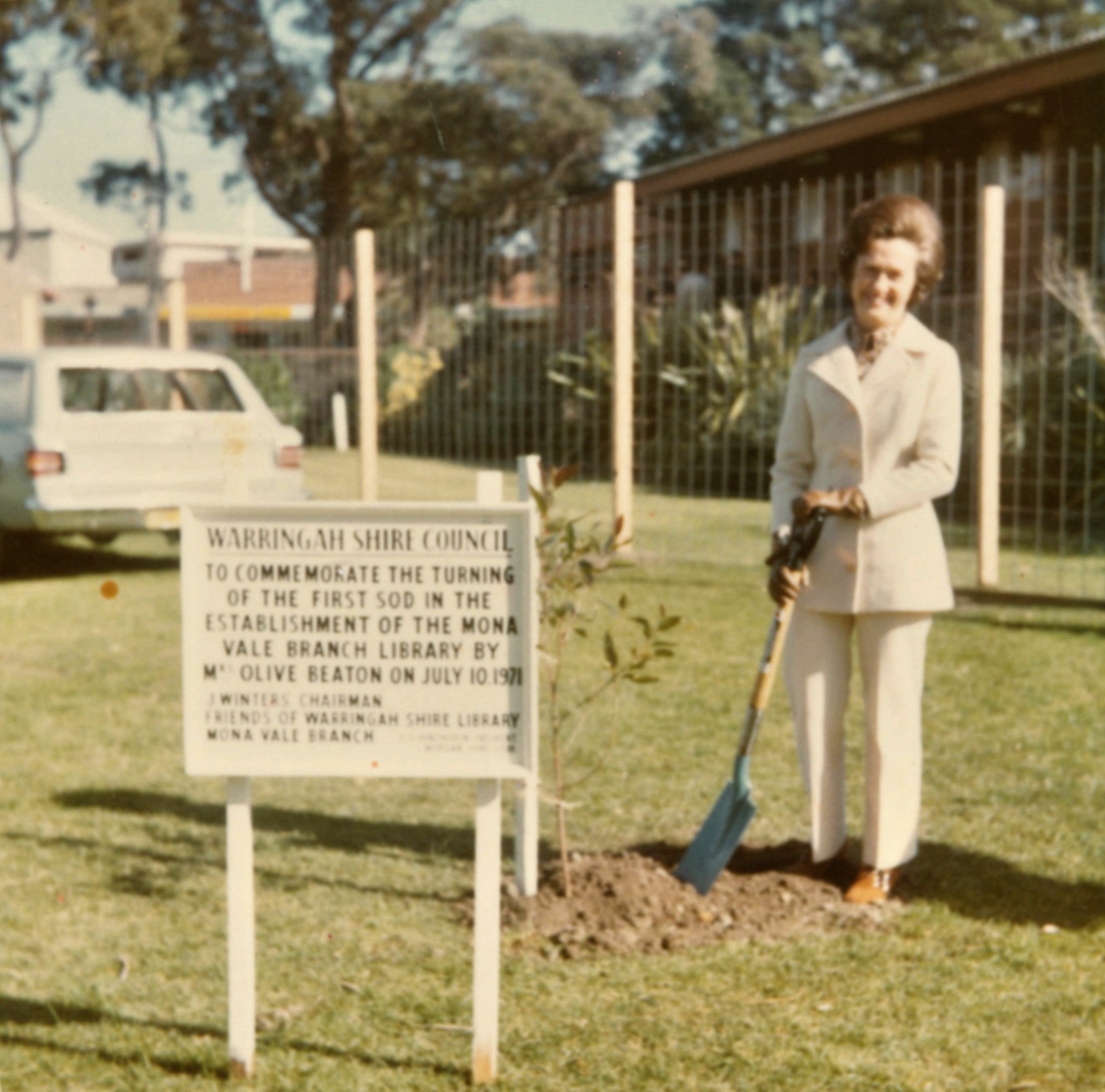 Olive Beaton turned the first sod of dirt before the construction of Mona Vale Library on July 10th, 1971. A special ceremony was held in her honour, to recognise her tireless work and passionate advocacy in bringing the project together.