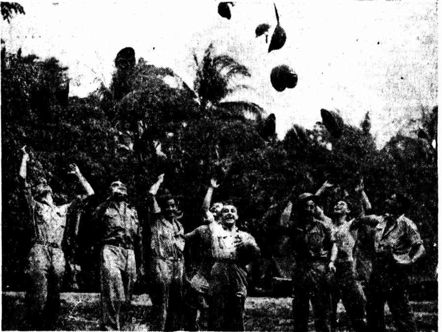 These R.A.A.F. men in Borneo gleefully tossed their steel helmets into the air when' they heard of the Japanese surrender. Australian Official Photo. PEACE: (1945, September 4). Warwick Daily News (Qld. : 1919 -1954), p. 1. Retrieved from http://nla.gov.au/nla.news-article190950745