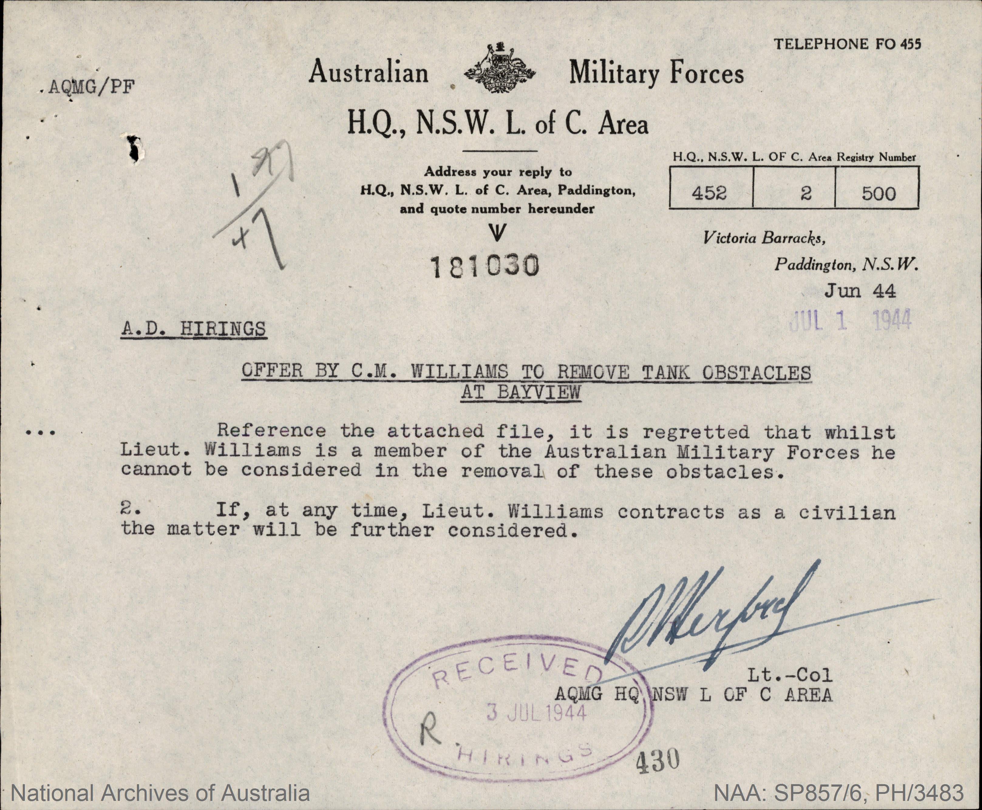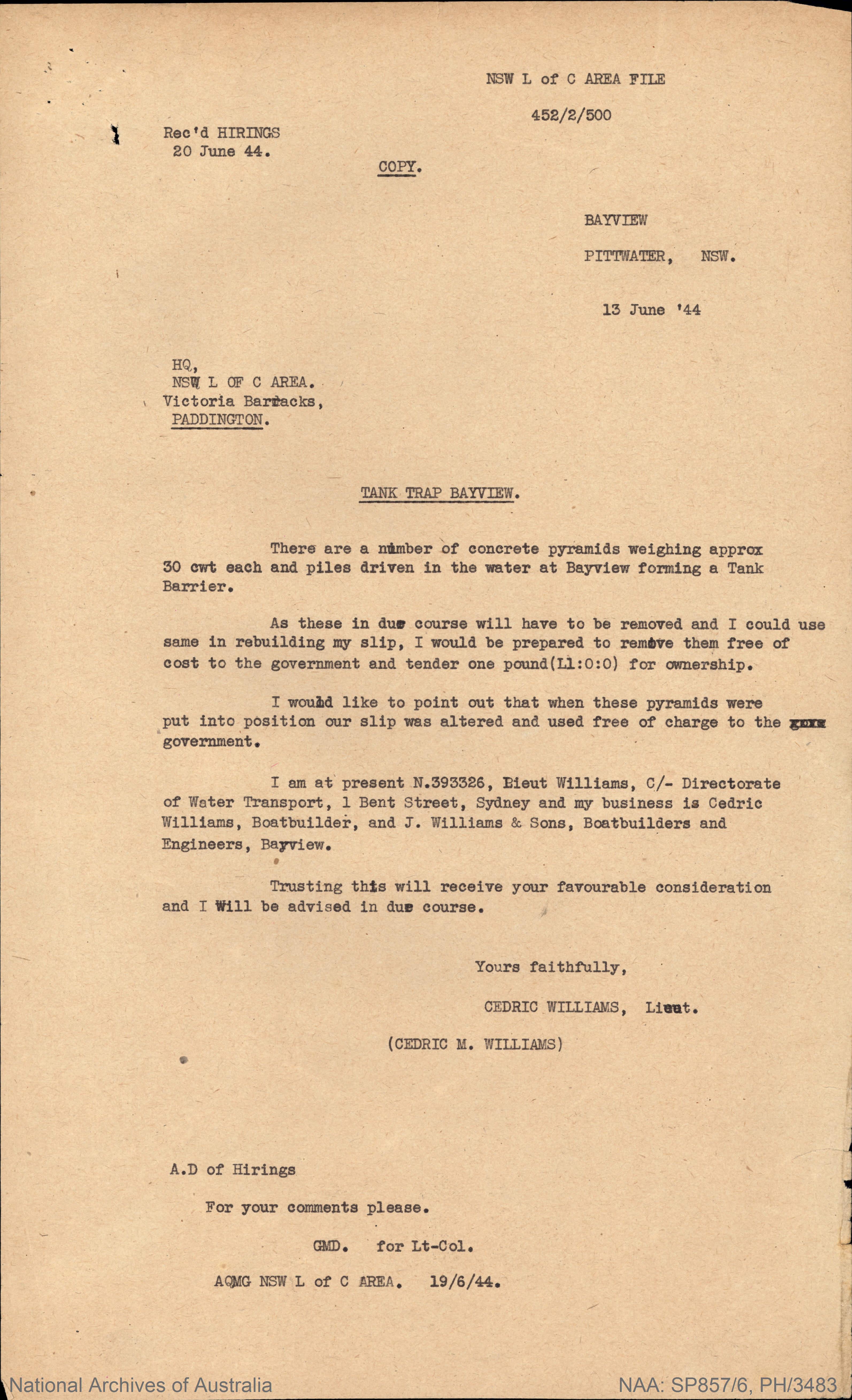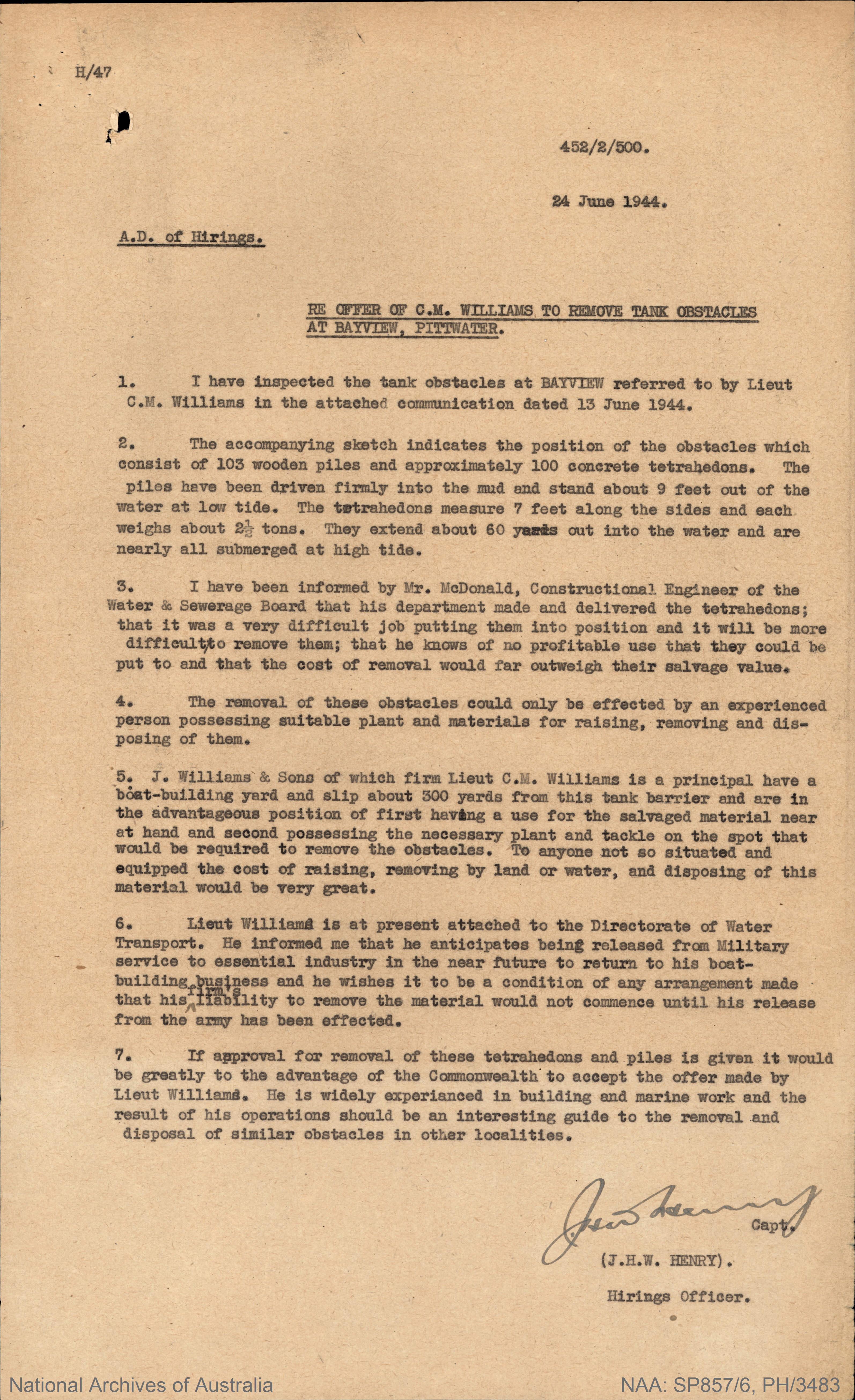 The war records provided by the National Archives of Australia show Boatbuilder Cedric M Williams was still enlisted and serving when he first mooted using these tetrahedrons as such. The Williams boatshed was then near the Bayview wharf - Cedric M served with the Volunteer Defence Corps (VDC)initially until good use was made of his knowledge of boats or 'small craft' as his records show. Additionally Elizabeth Hird (nee Williams, Cedric's sister and daughter of Cedric M) recalled her mother helped make camouflage nets for the army units stationed at Bayview: