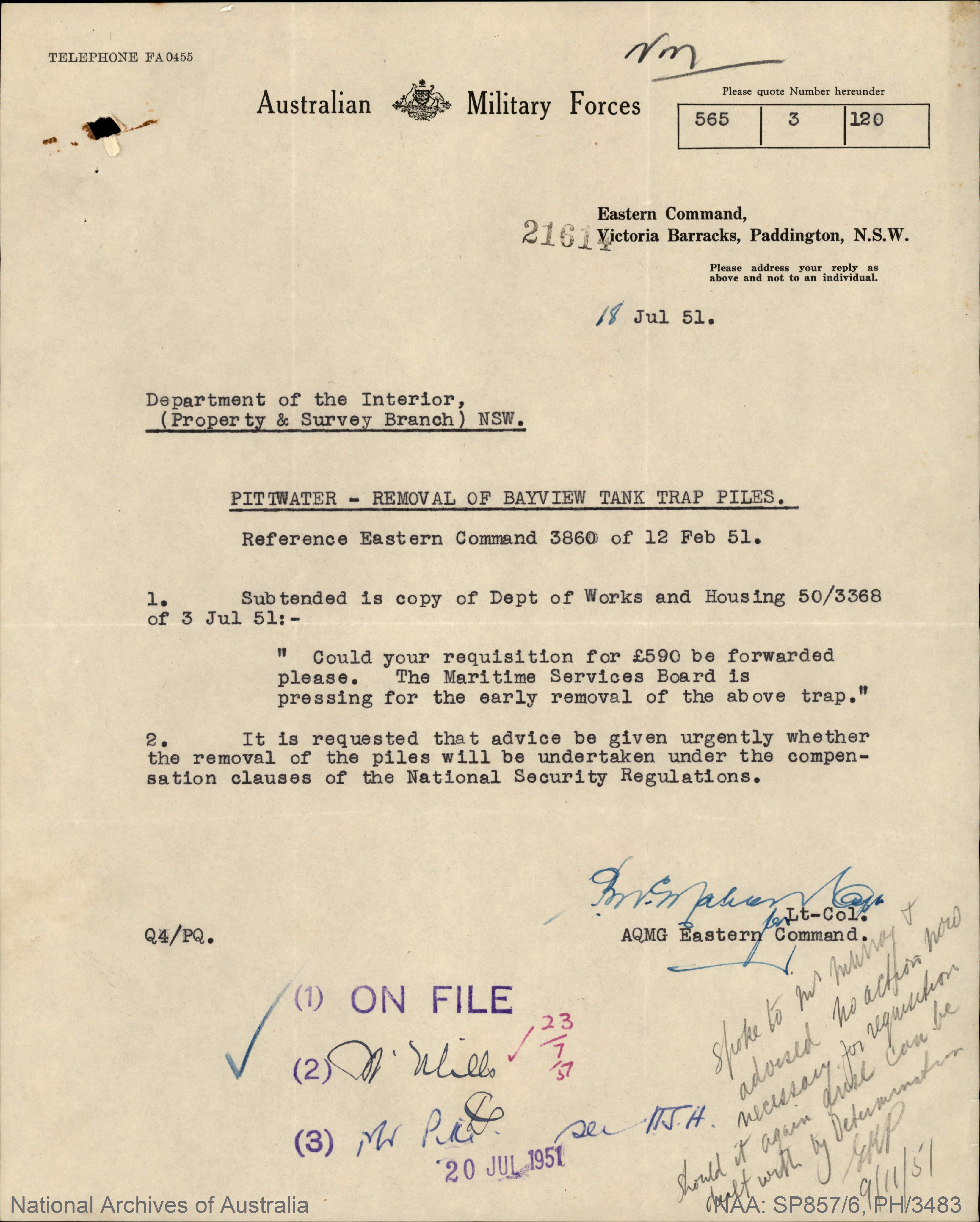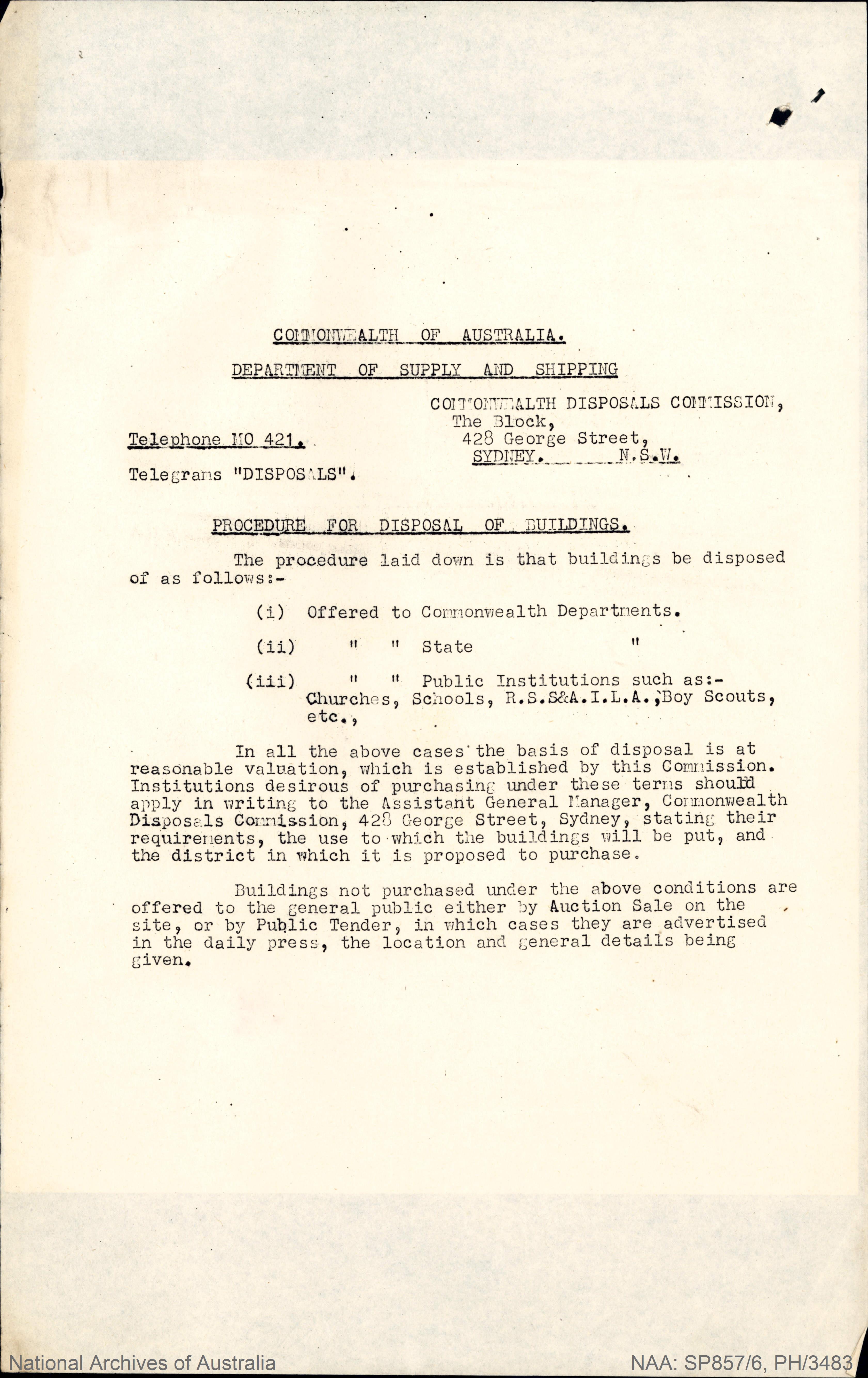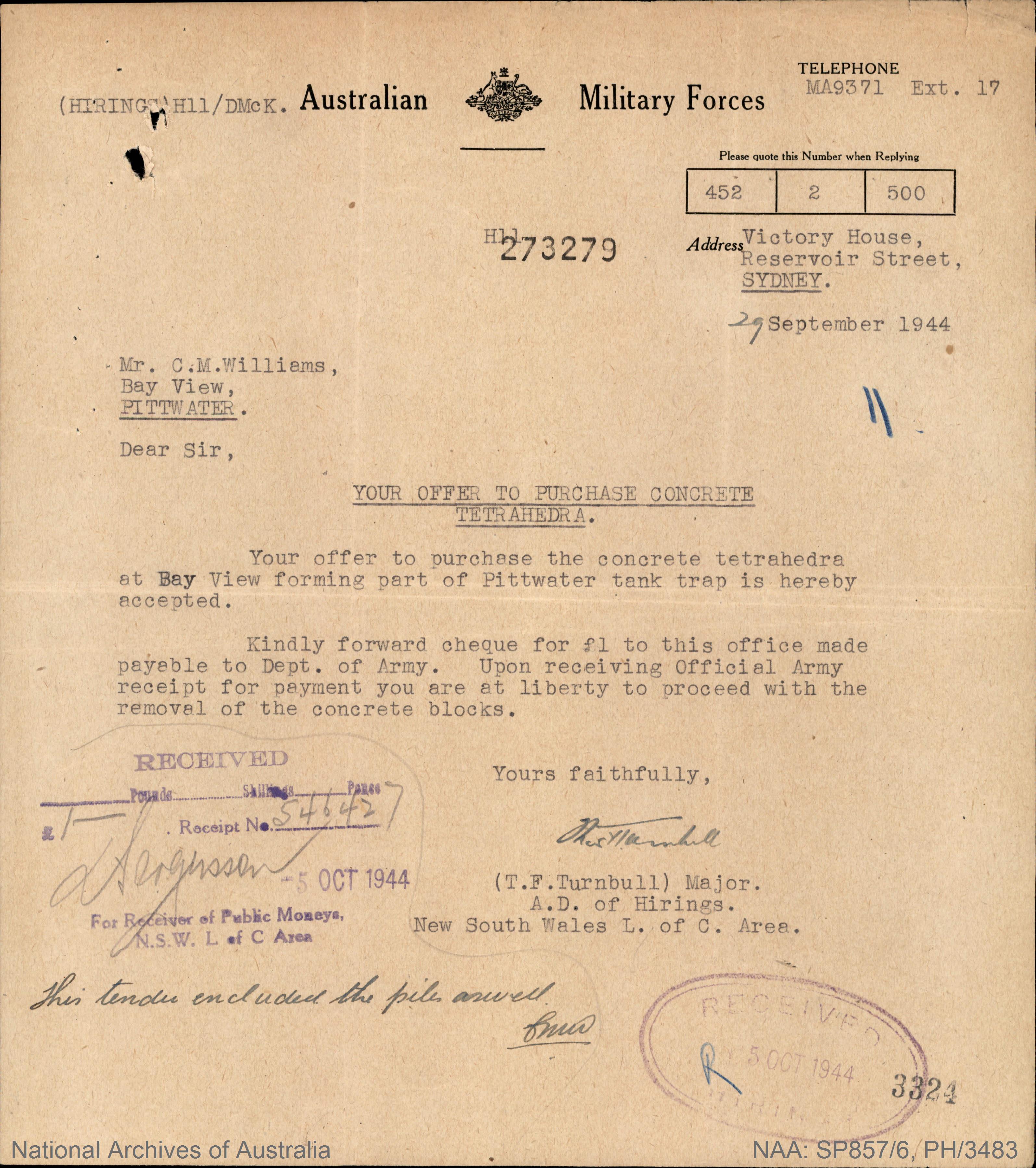 Cedric M Williams was given permission to remove these tetrahedrons once he was discharged. What is interesting about what else was found in this file is the permission given for people to purchase any excess equipment used then - Geoff Searl OAM of ABHS related that the first 'shed' for the Avalon Beach RSL was, to his knowledge, one of the old sheds from the Sun Down camp at Ruskin Rowe.