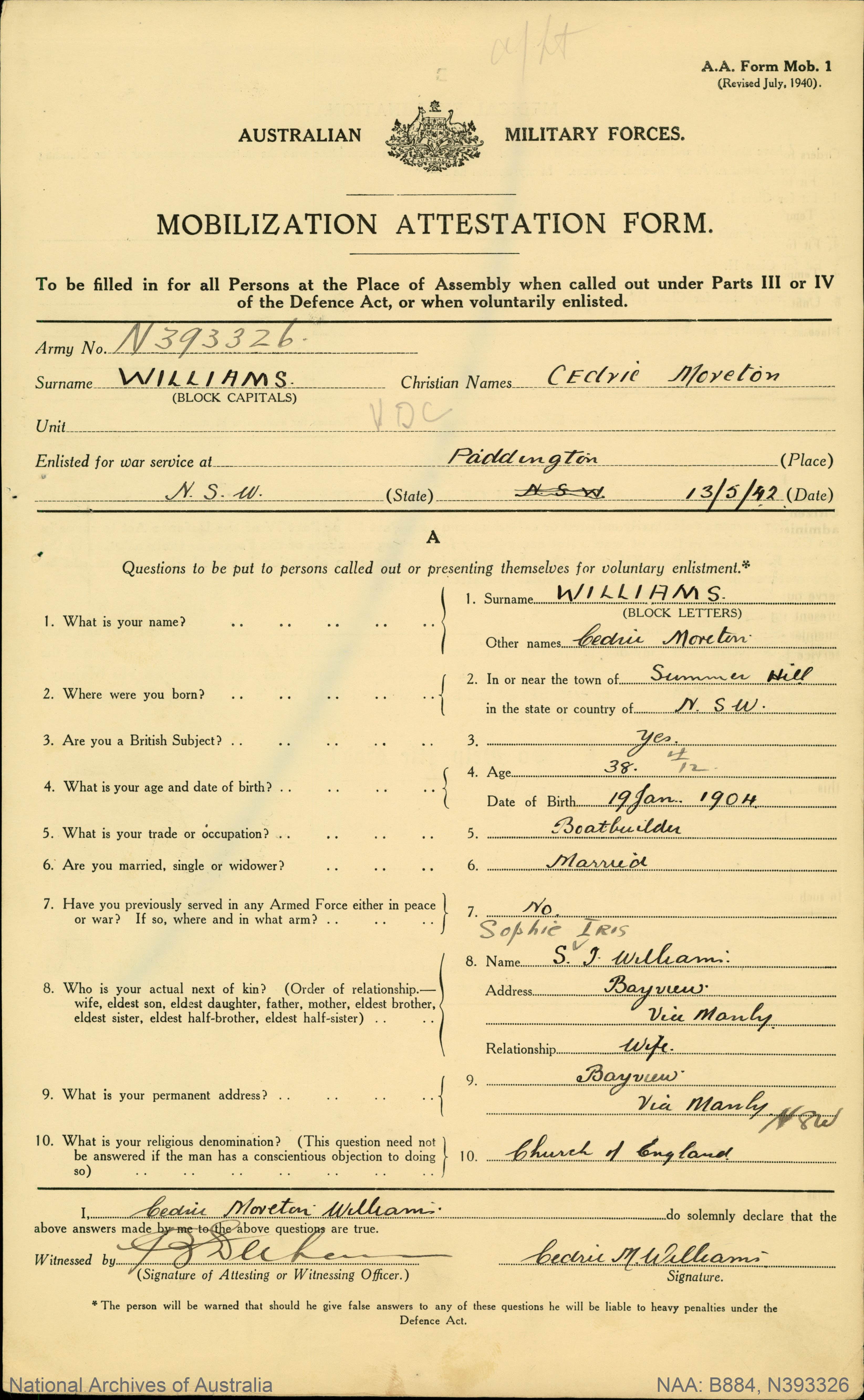 Cedric M Williams, photo courtesy the Williams family - WWII: National Archives of Australia Records - WILLIAMS CEDRIC MORETON : Service Number - N393326 : Date of birth - 19 Jan 1904 : Place of birth - SUMMER HILL NSW : Place of enlistment - PADDINGTON NSW : Next of Kin - WILLIAMS SOPHIE. Date range: 1939 - 1948