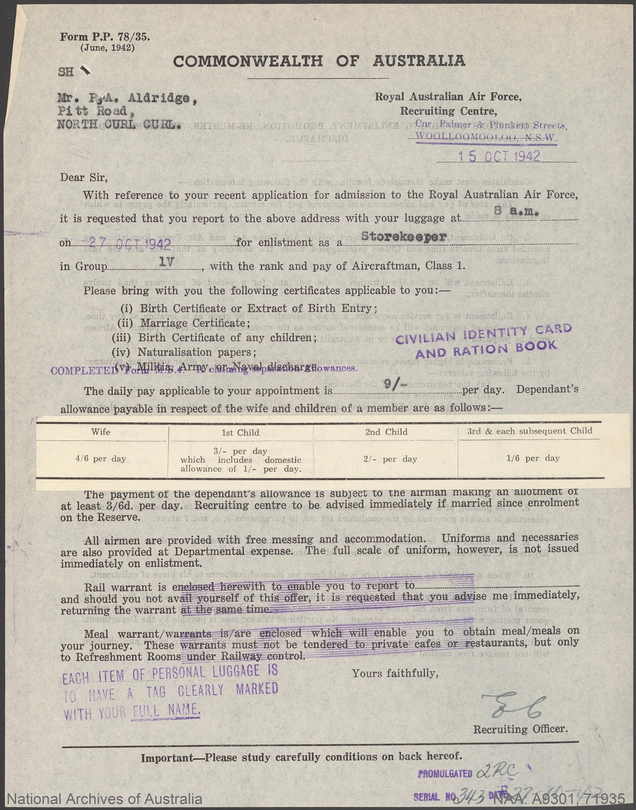 On 17.11.1942 he is charged with ‘neglected to obey standing orders’ ands also went AWOL again, for a whole day. On January 267th 1943 he faces a Court of Inquiry held at ‘Georges Heights, whereat the court decrees he illegally absented himself from 21.12.1942 and is still absent. A warrant for his arrest his issued on 28.1.1943 for ‘absconding’. Charged £11-5-11.