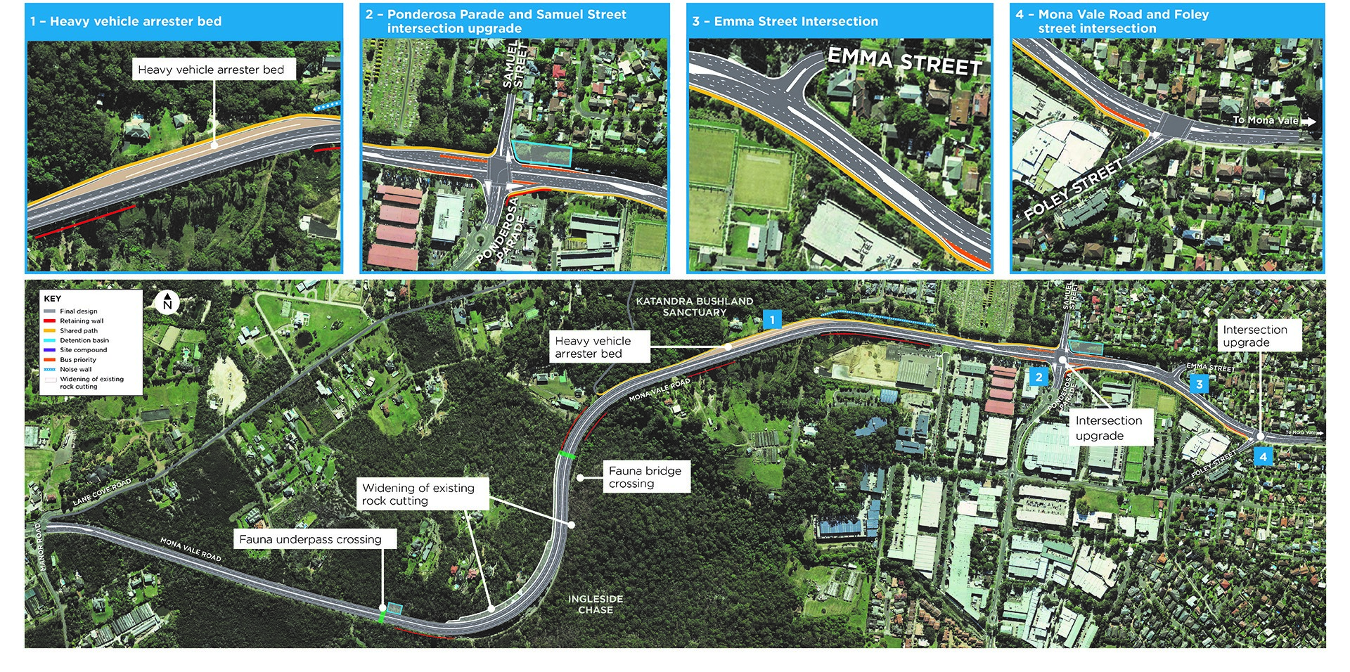 - Replacing the existing roundabout on Mona Vale Road at the intersection of Ponderosa Parade and Samuel Street with new traffic lights and signalised pedestrian crossings on all legs
