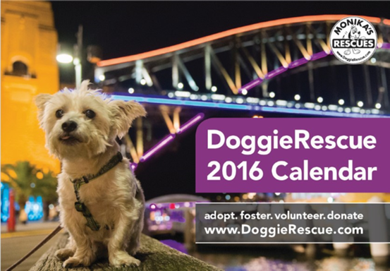 The 2016 DoggieRescue calendar with adorable Maeko featured on the cover.