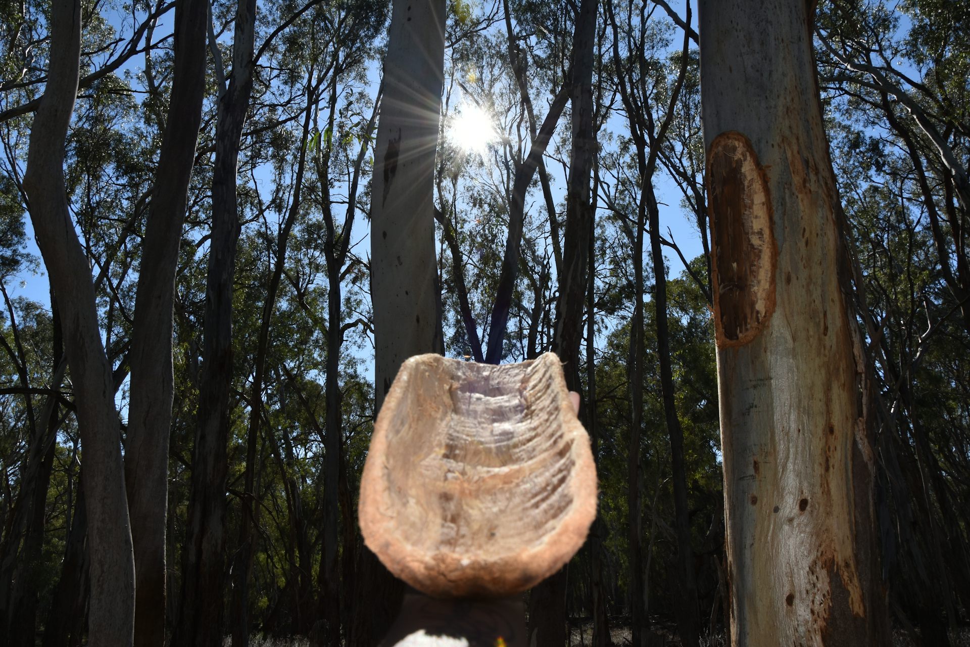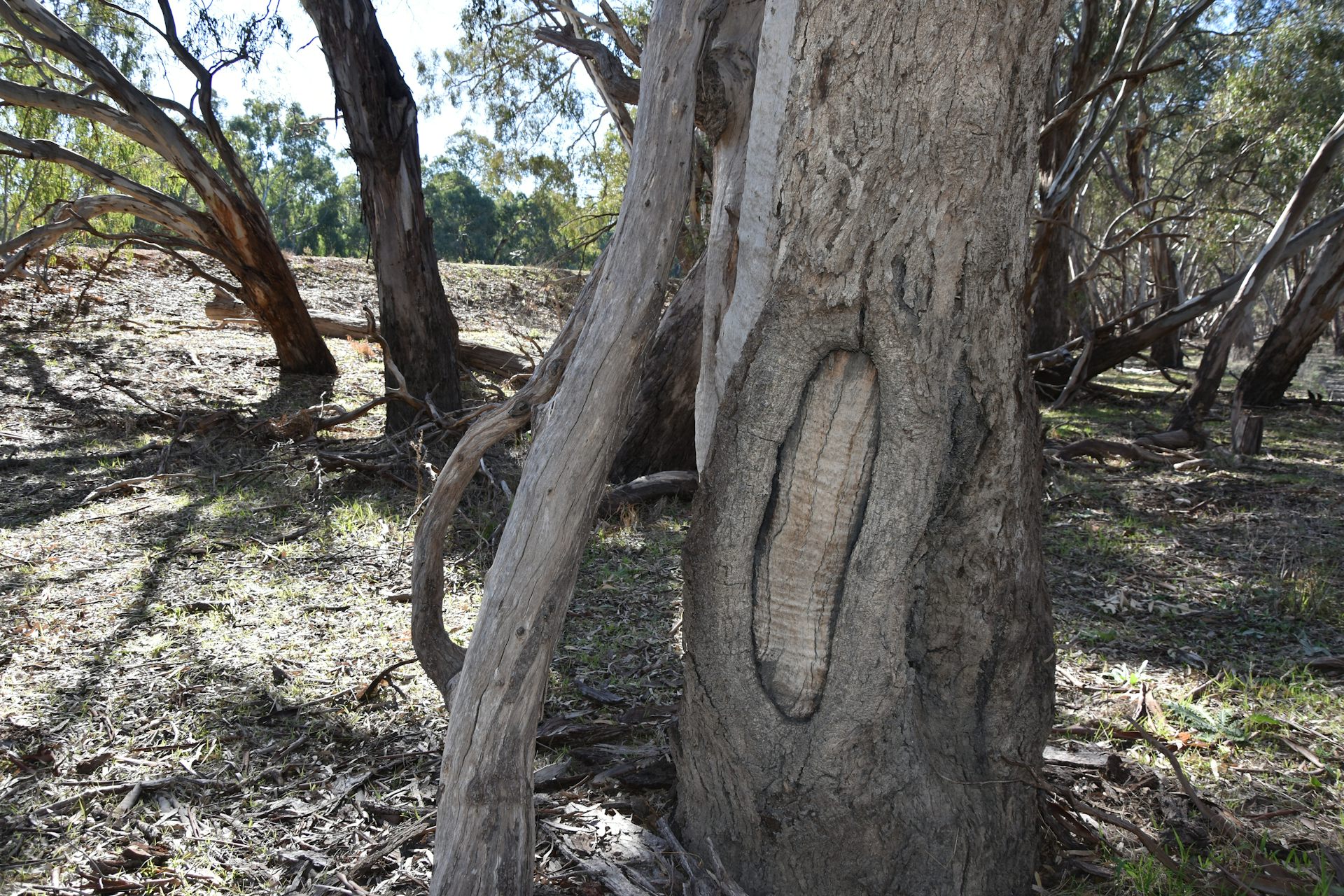 Scarred trees are still commonly made by Wiradjuri people. Species of eucalypt, particularly red gum, yellow and grey box are carved and, when their bark is soft, removed to make coolamons (wood or bark carrying container) and canoes. Red gums are manipulated while young, their branches interwoven. Commonly called ring trees, they are said to mark boundaries and line the banks of the Marrambidya (Murrumbidgee River).