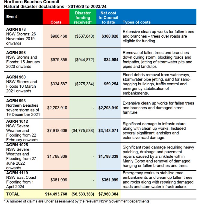 The following table sets out the types of costs incurred by Council in the past 5 years for natural disasters. Northern Beaches Council Natural disaster declarations - 2019/20 to 2023/24: