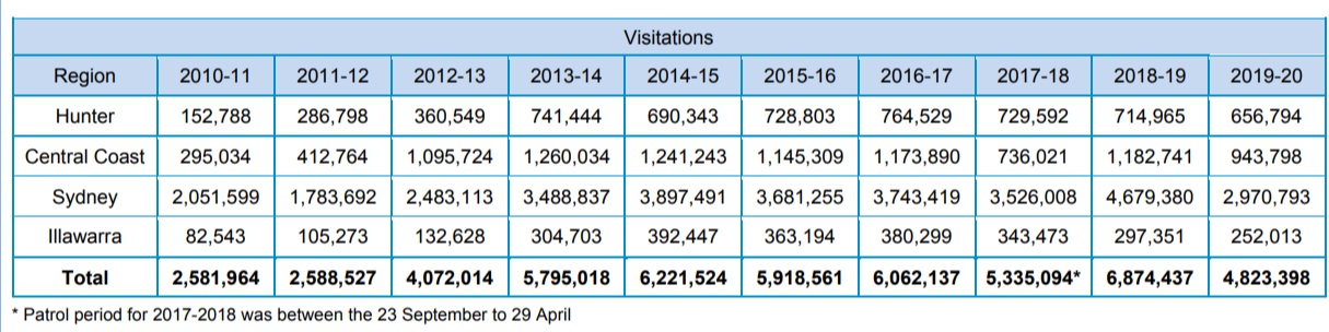 SLS NSW provided the following beach visitation figures for the past ten years for the regions listed. The recorded beach visitation is the combined total of attendance as assessed in the morning at the start of each patrol, the mid patrol point (1pm) and in the evening at the end of each patrol for the period 25 September to 25 April of the next consecutive year. The summer beach visitation within the area of the SMP over the last ten years averaged over 5 million people per annum. The slight drop in beach attendance in 2019/20 may be related to reduced outdoor activities and travel in the latter months of this period as a result of government initiatives to reduce the spread of COVID-19.