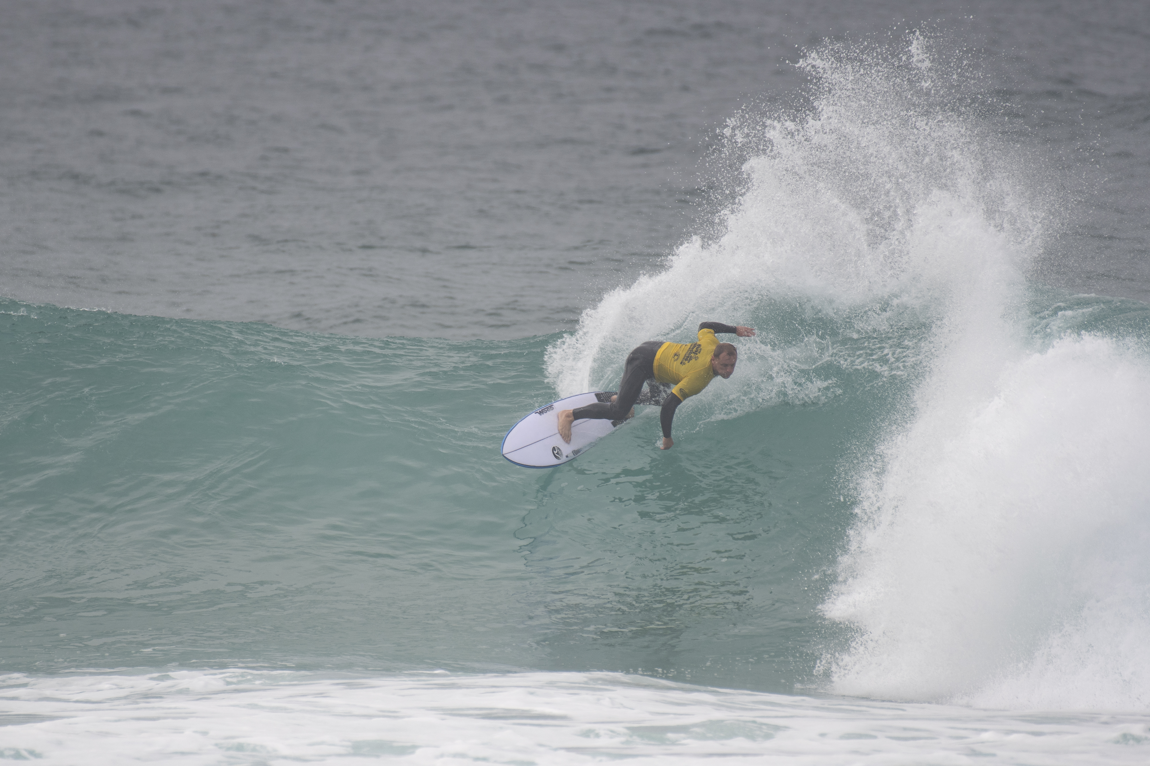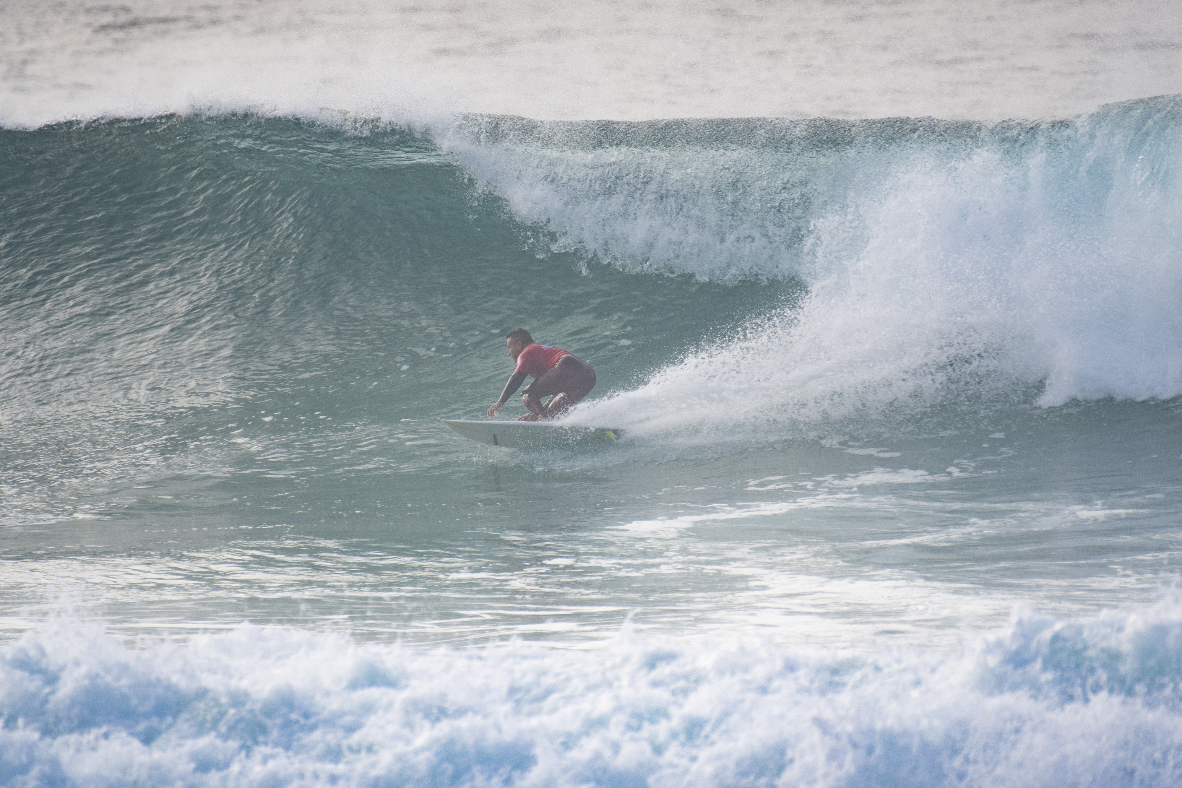 Over-40s surfer Sean Lancaster (Merewether) found himself at home in the throaty surf, effortlessly nailing turns and snaps in the low-tide conditions. Lancaster was duly rewarded with a solid 7.50 wave score that allowed him to take the win and seal himself a spot in the quarterfinals.