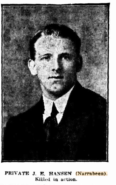 PRIVATE JOSEPH ED. HANSEN (Narrabeen), killed. HEROES OF THE DARDANELLES. (1915, July 1). The Daily Telegraph (Sydney, NSW : 1883 - 1930), p. 9. Retrieved from http://nla.gov.au/nla.news-article238921751
