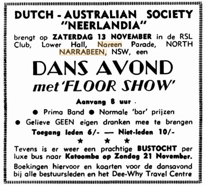 The Narrabeen RSL Club in its present location has been servicing and supporting the community since 1956, which means this year the club and its members are celebrating their 65th year. The club would like to hear from or see any old photographs people have associated with its members and history.