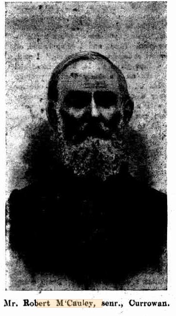 The death of Mr. Robert McCauley, senr., of Currowan, Nelligen, Clyde River, on the 22nd January, removed one of the best known citizens in that part of the State. Deceased was a generous and active worker in all Catholic movements, and his death means a great loss to the community. Mr. McCauley was born in Moville, County Donegal, Ireland, in the year 1832, and was in his 83rd year. He arrived in New South Wales with this parents 80 years ago, when they settled at Wollongong.