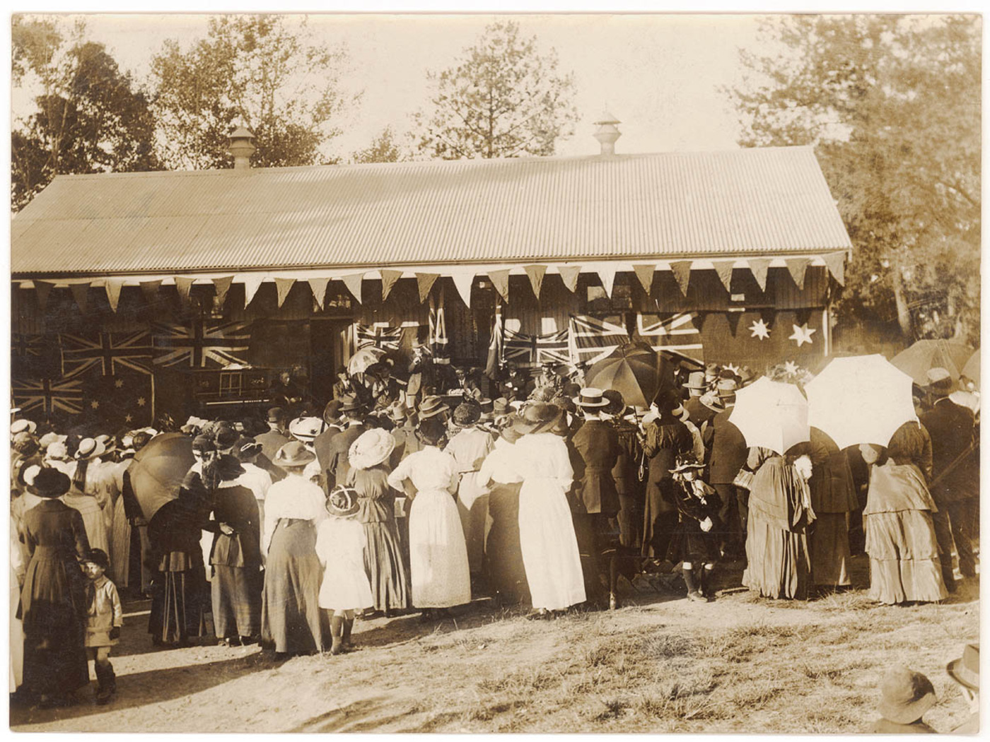 In 1914, the Australian public celebrated its allegiance to the British Empire in a variety of ways. Britain was widely referred to as ‘the mother country’; school children swore allegiance to the King and learned about the Empire and its values through textbooks, songs and plays; and images of the King were displayed in schools and other public buildings. Empire Day was celebrated each year on May 24th – the birthday of Queen Victoria – with gun salutes, displays of the Union Jack, patriotic music and speeches, and street carnivals with bonfires and fireworks.