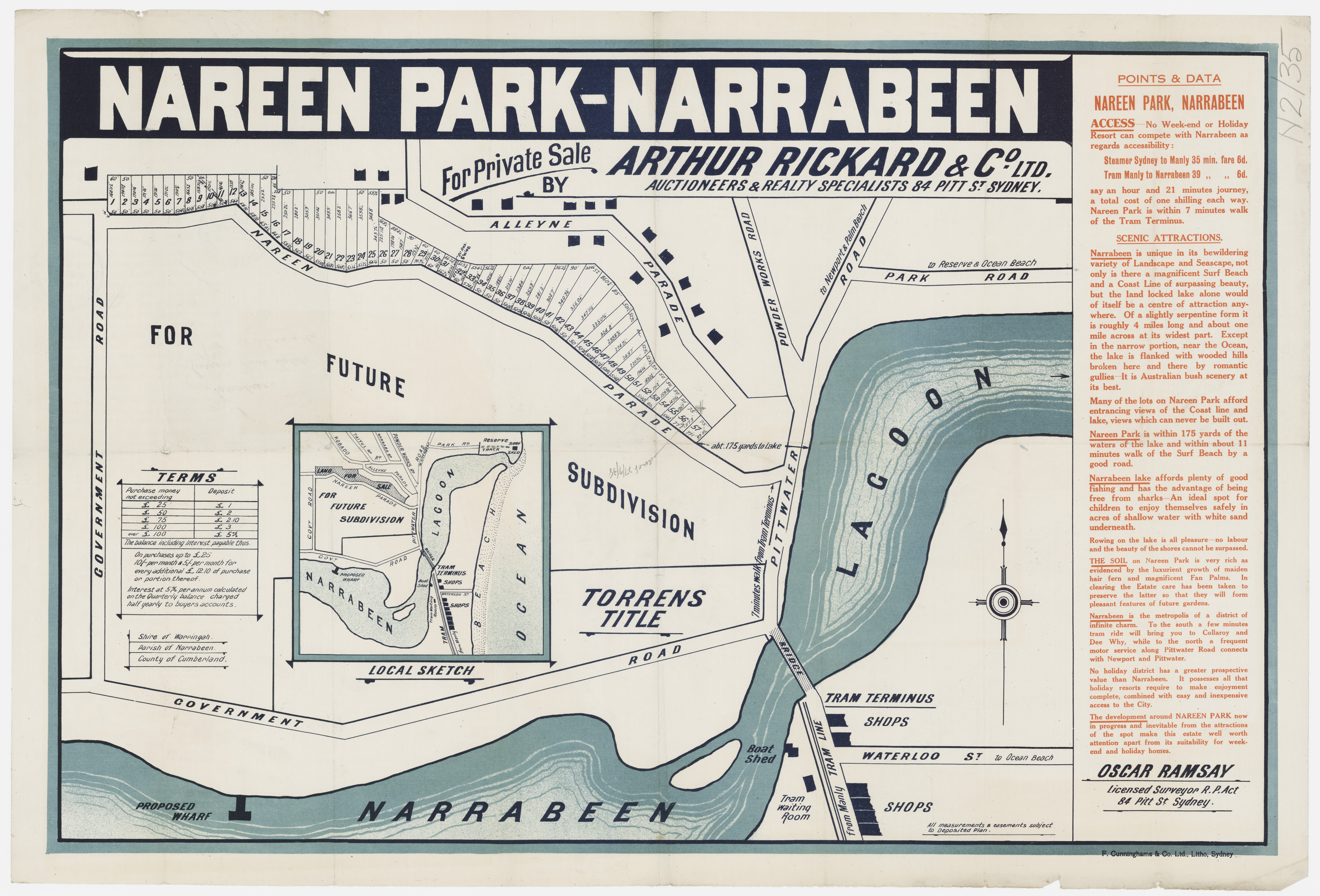 Nareen Park - Narrabeen, 1921; Government Rd, Nareen Pde, Alleyne Pde, Powder Works Rd, Pittwater Rd. Item c050370035, courtesy State Library of NSW - Narrabeen Subdivisions folder